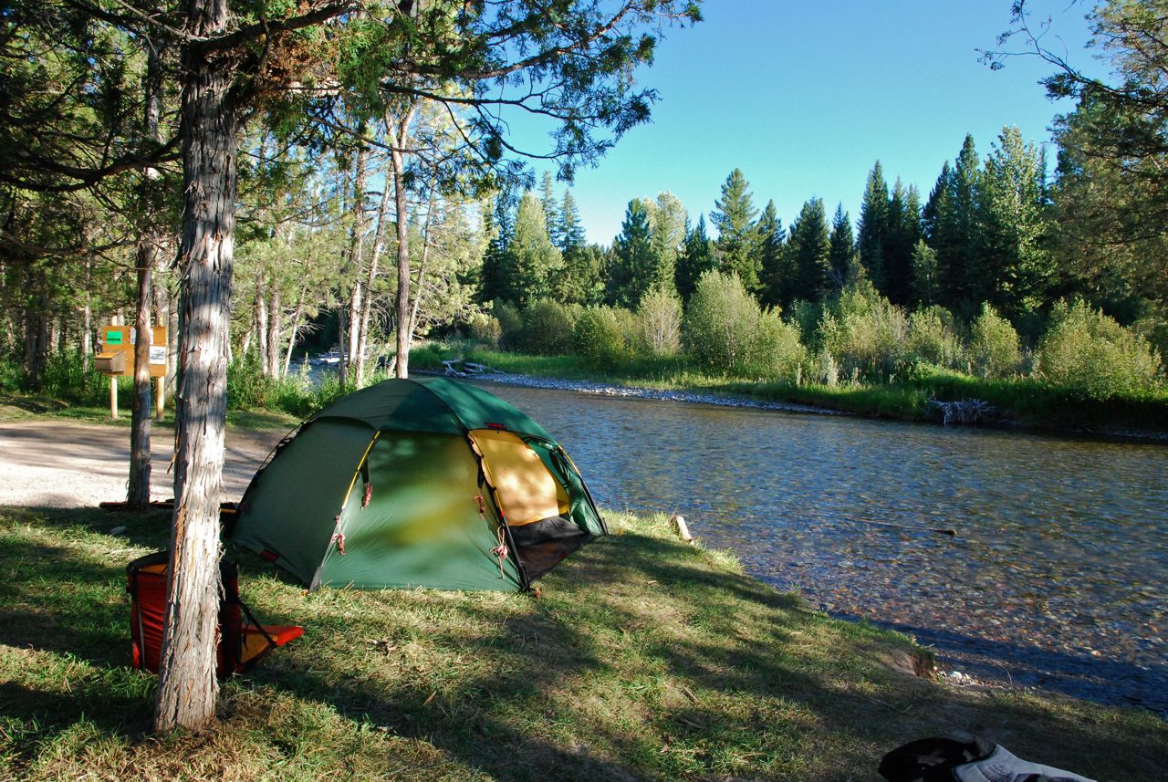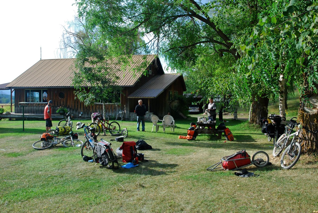 By the end of the day in Whitefish we’d done the town thing – stocked up on supplies, got my rear wheel hub overhauled and been to the library/internet and were ready to get out of town. We cycled 30km to Tom Arnone’s house near Kalispell. He’s a cyclist/engineer/pilot/amazing fix-it man who has a patch of lawn and amazing hospitality for passing Great Divide cyclists. His house is full of pictures and memories of adventures both in family and bicycles. His workshop had me and all the other boys/men drooling with envy. We wondered how he manages to keep it so cluttered with his wife Pat doing such a good job of the house and garden. There are parts of track, road and mountain bikes he’s built and a similar array of motorbikes and associated bits. Then there are the stunning wooden canoes he’s built… I want to be like him when I grow up (or at least have the ability to build or mend anything in any material).