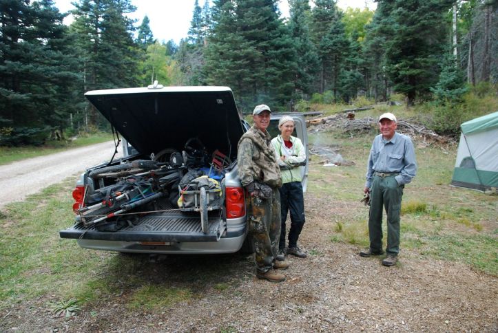 After a night camped on the river-bank at Abiquiu we head up (and up, and up and even further up) on the route to Cuba (a town, not the country). This gave us some of the most technically sustained up-hill we’ve done. We also thanked our lucky stars it wasn’t wet as the dreaded caliche would strike again. In fact water wasn’t in evidence at all. We had some donations (unprompted) from the elk hunters swarming over the Mesa. It was while bumping along a down-hill that Sarah’s trailer link-pin sheared and all came to a grinding halt. Just as we were puzzling how to jury rig this one, some hunters who’d only 20 minutes before stopped and spontaneously given us water and taken our trash turned up. Ron, Nate and Phil then proceeded to take us and our bike down into Cuba, wait while we got a new rod (and a spare) fixed up and then drop us off at our over-night camp spot in the hills short of Cuba. Kindness and relaxed generosity helped us through – and saved us 25km of riding.