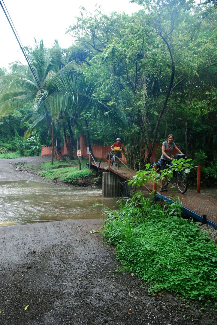 All is well with the world. Sarah and Anna Kortschak, another cycle tourist who we've been tracking down México and central america, enjoying the back roads of the peninsula, heading for Potrero.Playa Brasilito was another of the lesser frequented beaches, and had some of the better bodysurfing waves we tried. Luminous evening stormlight helped the moodEven the small, dirt roads we used for most of our Nicoya navigation had billboards proclaiming the merits of gated, secure "eco"communities. We were never sure what was "eco" about them. Costa Rica has a substantial US expat population so the majority of adverts and property sale notices are in english or spanglish at mostRain dominates the day, with afternoon or evening storms, and sometimes frontal systems giving continual lighter wetness. All of this swells the rivers, meaning that we had a better time getting around than the car-drivers with lots of these handy foot bridges.Brooding skies and storm-surf formed the backdrop to a nice section of coast from Playa Tamarindo to Playa Garzo with a only a few ramshackle villages. The peace was probably aided by a number of river crossing that would have been difficult by car