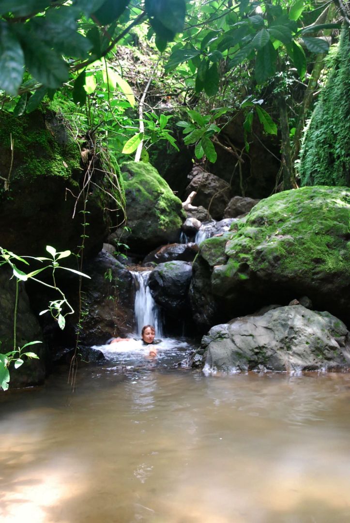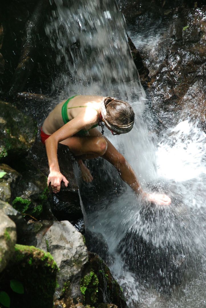 Heading up into the mountains and cloud forests after leaving the peninsula we found some very welcome swimming opportunities. Anna getting fully immersedand Sarah getting a showerThere are 2 cloud forest reserves in the Costa Rican highlands. Monteverde is the more famous, but we chose Santa Elena as there are fewer people. Peace reigns, with tantalising bird calls and true to the name, lots of cloud...We spent an afternoon following one of the walking trails. There's lots of colour to punctuate the verdant lushnessSarah and Anna taking a break along the often steeply undulating rocky dirt road from Santa Elena to Tilarán