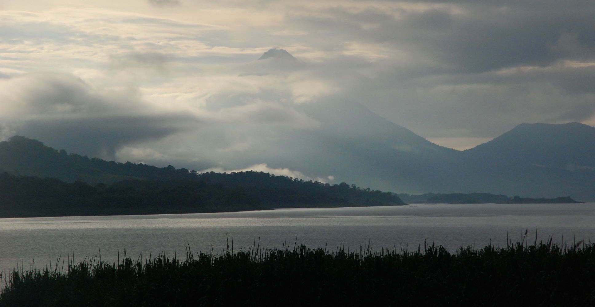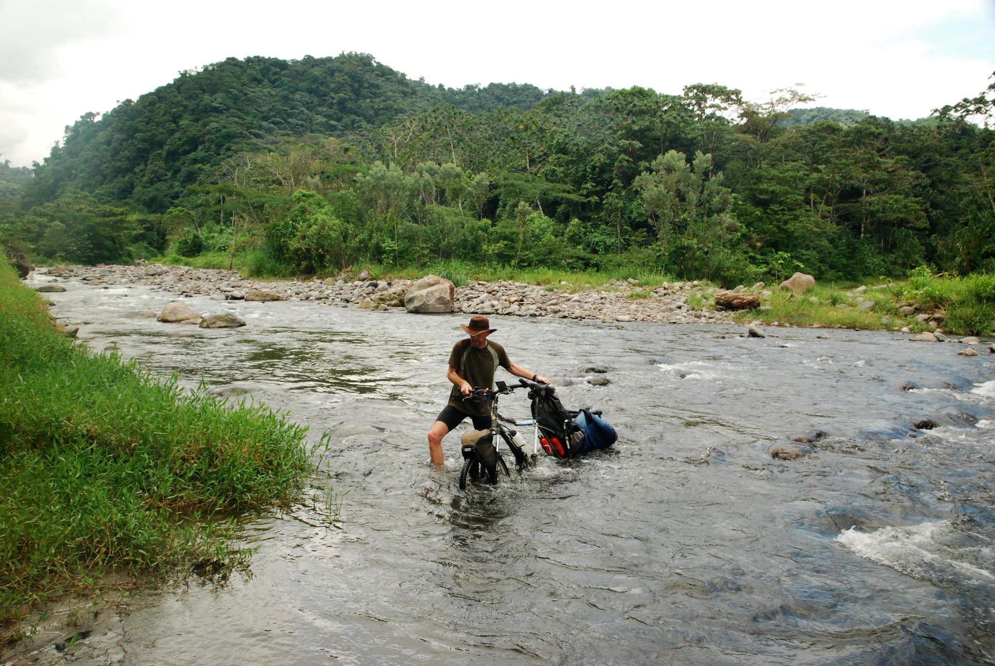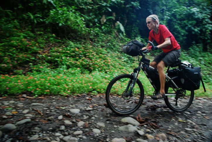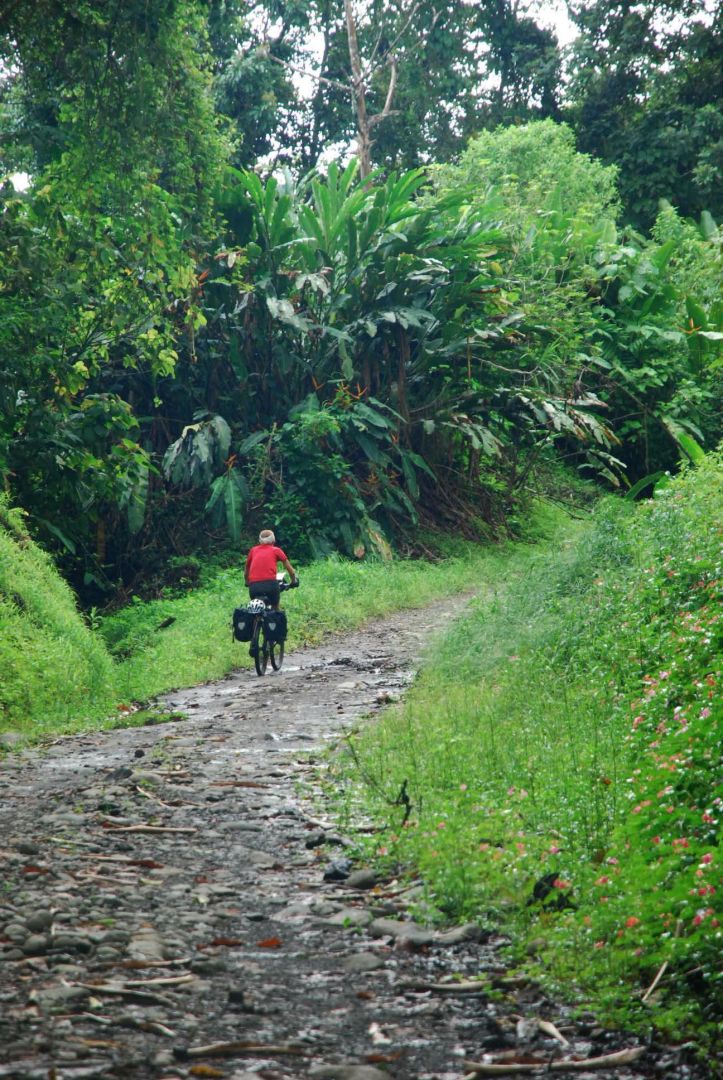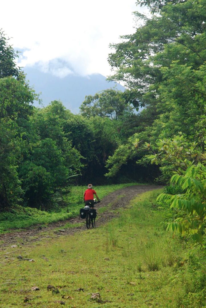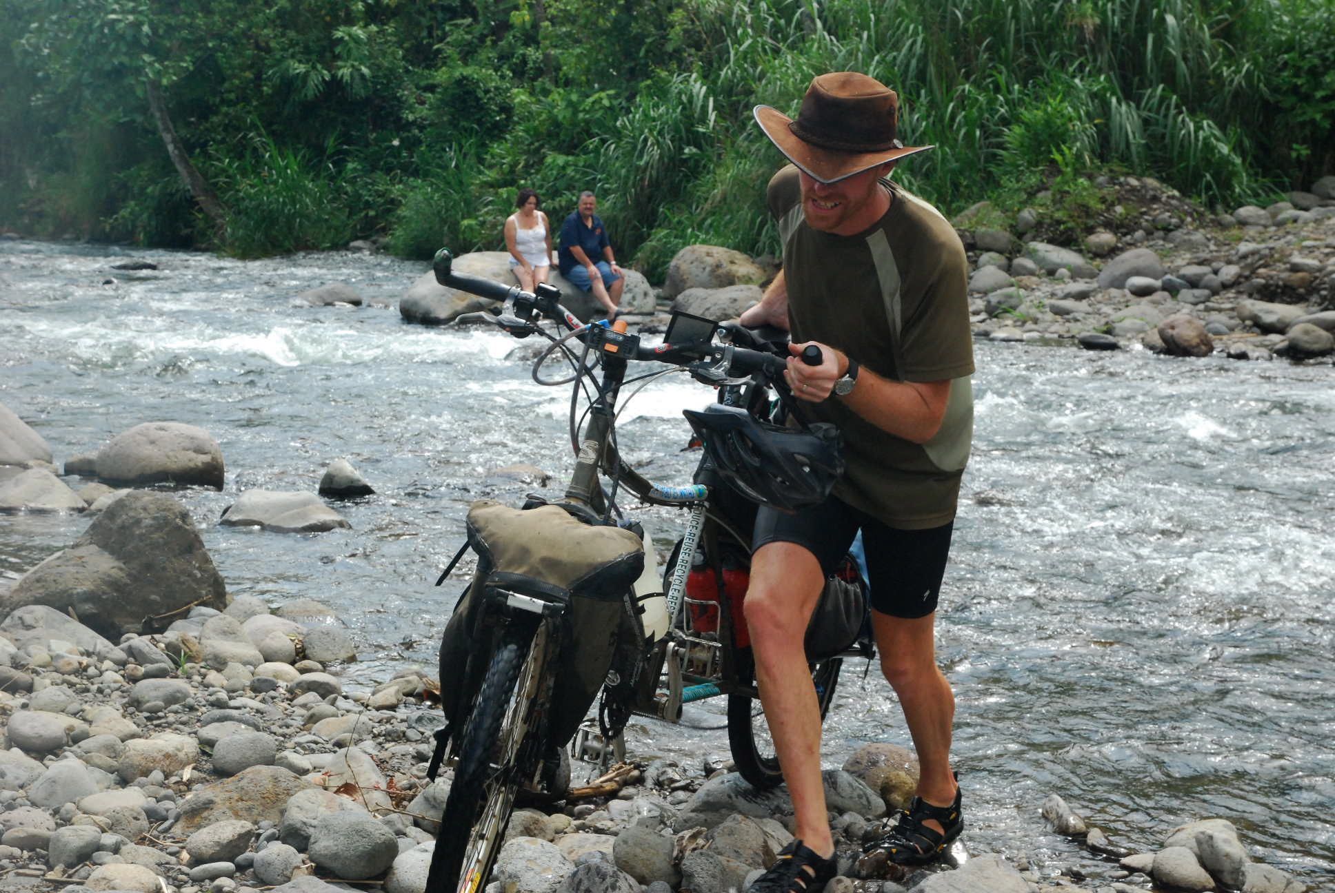 After a late start we only get as far as this cow shed before the heavens open and after moving our stuff into an ever decreasing patch of dry floor we eventually put the tent up on the same spot as the rain shows no signs of abating.Volcan Arenal fulfils all criteria for 'classic volcano shape' status, but is only intermittently visible to us as we work our way along the southern shore of Laguna Arenal. Dawn after a night of rain gives us a grandstand viewWhile the northern shore of the lake has a busy paved road full of tourists and traffic, the one we pick is much better. It is mildly undulating and non-thought provoking as far as Viejo Arenal, then things liven up quite a bit. Sarah enjoying the easy bit...Go the legs! The only traffic we meet after Viejo Arenal are a couple of horses. The road has lots of melon shaped smooth rocks requiring considerable concentration. The ups are sometimes push-worthy, and the downs skittery, slidey affairs with lots of potential for tumbles. Somewhere along the way my bike jettisons the bicycle pump...The calm before another 'interesting' descent, complete with background volcano. All we did was pick the smallest road, and we get this. Life is so hard sometimes!About mid-morning we discover why there isn't any traffic on the road/track we've been enjoying mightily.. Me deciding that this particular bit of the Caño Negra isn't a particularly good bike-fording spot. Getting across without a bike is beginning to feel pretty dicey too... (photo S.Hedges)So better to find another point of attack - why is there always an audience for these things? (Photo S.Hedges)Take two - steady as she goes with the bike, having already done a crossing with the bags and given the camera to a very smug Sarah who had picked the right line to start with (photo S.Hedges)Calm waters and the onward road is beckoning (Photo S.Hedges)