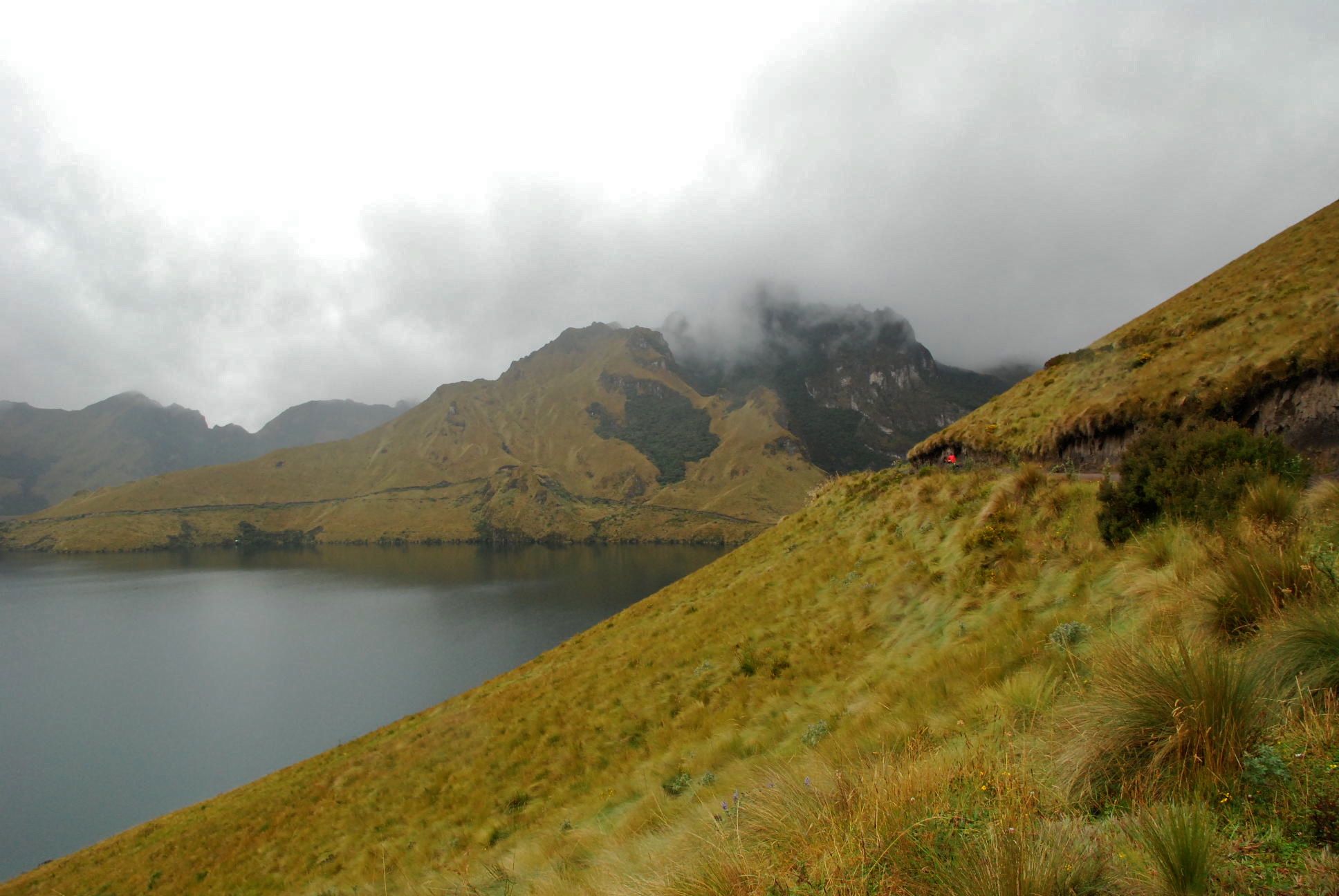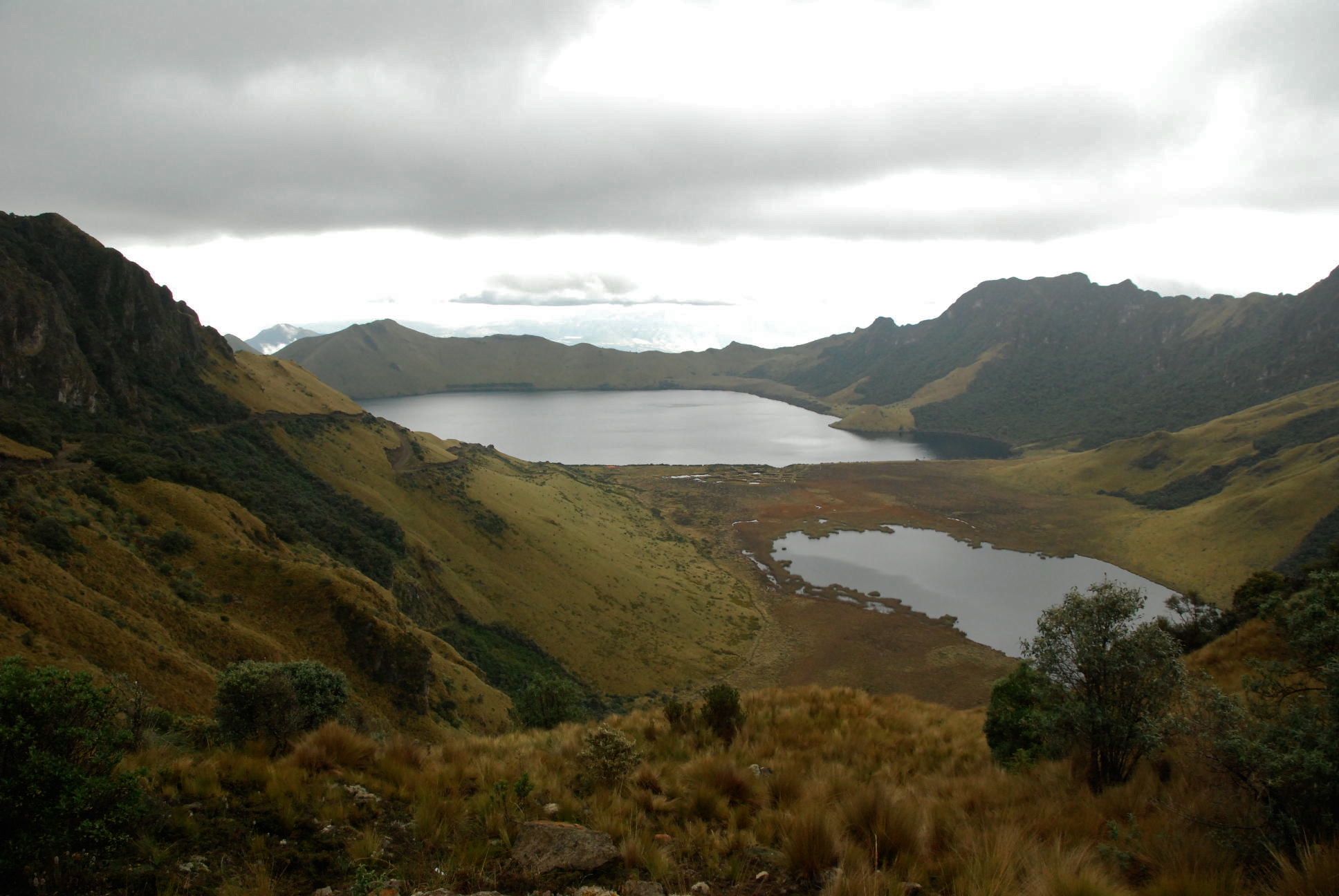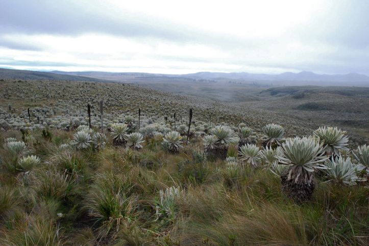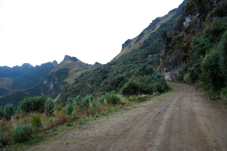 Although we prefer to avoid the Panamericana and other big highways, from Pasto to the border just after Ipiales it actually passes through some impressive countryside and isn't that busy.Blanca waved a happy greeting as we trundled past her house at 'camp o'clock'. Soon we were happily setting up on her roof, though not until after having to show her our down jackets and sleeping bags to convince her that we wouldn't freeze overnight! That evening, despite our protestations that we had food, she fed us 'sopa' and plied us with 'tinto' (sweet black coffee). The next morning, our last in Colombia, she told us about her husbands failing health and we understood the patina of sadness that overlies her face. After we'd thanked her for her hospitality again, she told us she was just being human. Colombians are truly wonderful people. (photo S.Hedges)The best days are such as these! We got off the highway within 15km of the border onto a route across the Paramo, or high grasslands.The Paramo is a wild, windswept landscape to rival our favourites on this trip. Apart from the pampas grass, there are 2 predominant plants that post their flowering stems high. The fluffier ones with leaves are frailejon, the others a yucca-like cactus.The well insulated flowering stem of the yucca-like plantsand the frailejonOtovalo is famous for an arts and craft market which overflows its weekday boundaries each saturday to become the biggest in south america. Even on a week day we found it a dizzying display of colour and woolly warmthAfter weathering the cobbles and what is becoming the daily rain, we arrive at Laguna Mojanda. Possibly because of the weather we have it to ourselves, and our minds drift to other similar places we love. Scotland and southwest TasmaniaAll that is already at the top of a climb must climb again. We cracked out the stove and defrosted before heading up to the pass near Cerro Negro. The craggy ridge-line on the left had us reminiscing about the Western Arthurs range in Tassie as we ground our way up the hillthen at the pass, with the cloud still holding off we are offered a vista worth the effort before a rattling, sliding descent down to 'civilisation'A few kilometres north of Quito the road crosses the equator and there is a proliferation of monuments. This is a sneak view, as we were too stingy to pay the entry fee!As we settle into the Casa de Ciclista in Tumbaco amid the cast-off bike parts, there are traces of cycle-tourists away doing other things and due to return.