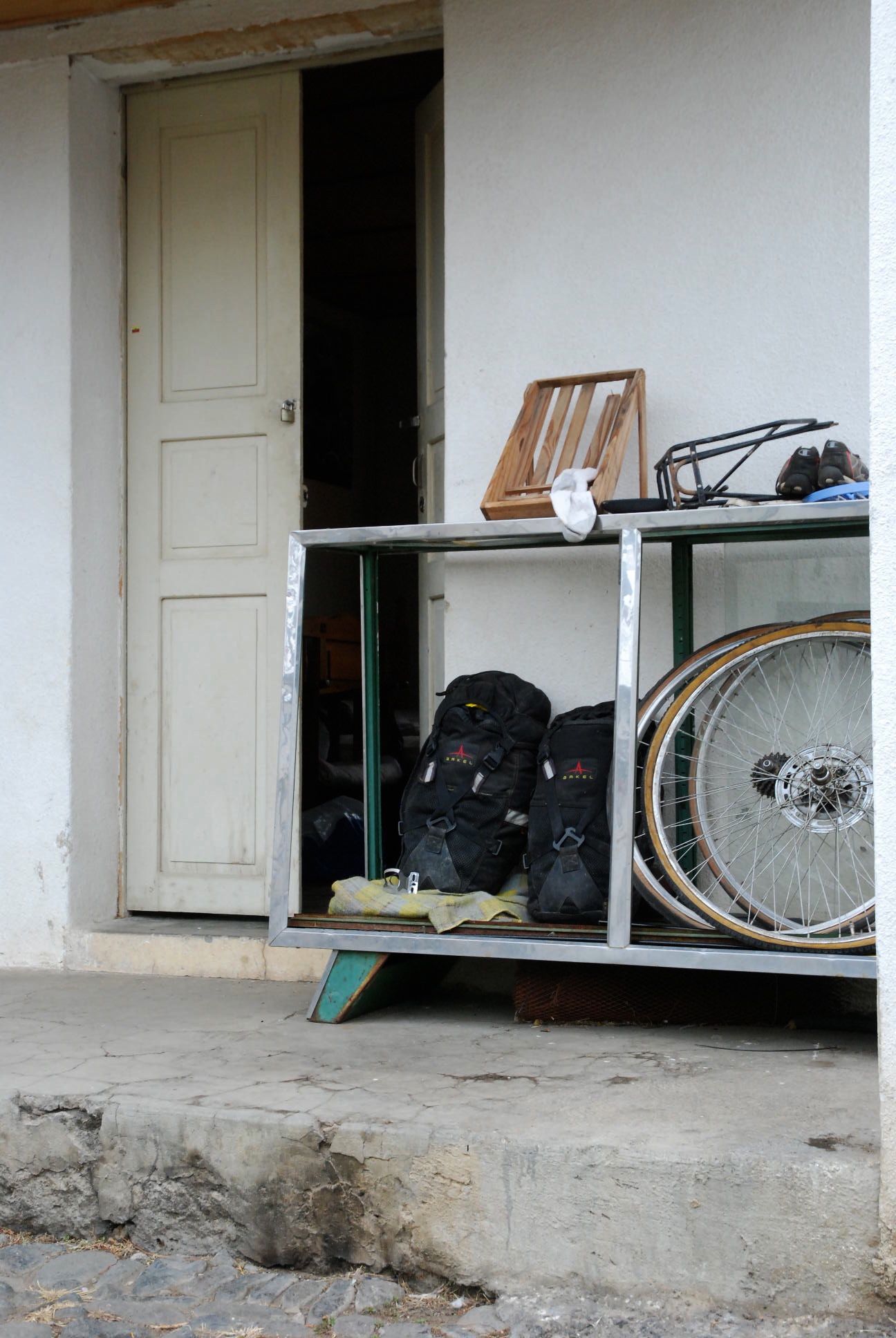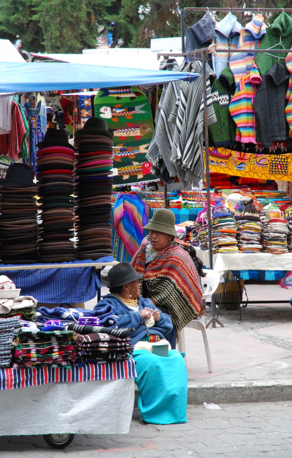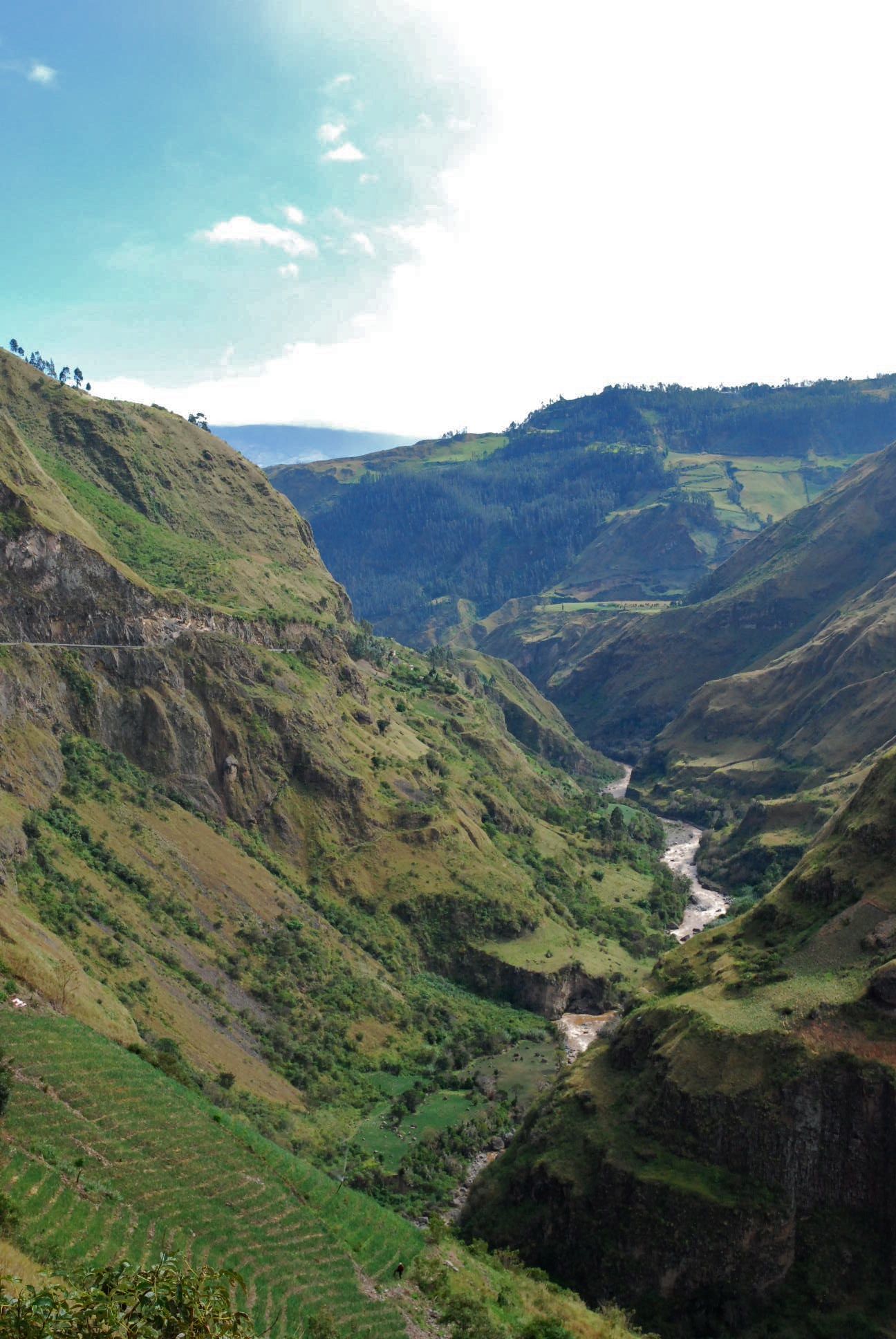 Although we prefer to avoid the Panamericana and other big highways, from Pasto to the border just after Ipiales it actually passes through some impressive countryside and isn't that busy.Blanca waved a happy greeting as we trundled past her house at 'camp o'clock'. Soon we were happily setting up on her roof, though not until after having to show her our down jackets and sleeping bags to convince her that we wouldn't freeze overnight! That evening, despite our protestations that we had food, she fed us 'sopa' and plied us with 'tinto' (sweet black coffee). The next morning, our last in Colombia, she told us about her husbands failing health and we understood the patina of sadness that overlies her face. After we'd thanked her for her hospitality again, she told us she was just being human. Colombians are truly wonderful people. (photo S.Hedges)The best days are such as these! We got off the highway within 15km of the border onto a route across the Paramo, or high grasslands.The Paramo is a wild, windswept landscape to rival our favourites on this trip. Apart from the pampas grass, there are 2 predominant plants that post their flowering stems high. The fluffier ones with leaves are frailejon, the others a yucca-like cactus.The well insulated flowering stem of the yucca-like plantsand the frailejonOtovalo is famous for an arts and craft market which overflows its weekday boundaries each saturday to become the biggest in south america. Even on a week day we found it a dizzying display of colour and woolly warmthAfter weathering the cobbles and what is becoming the daily rain, we arrive at Laguna Mojanda. Possibly because of the weather we have it to ourselves, and our minds drift to other similar places we love. Scotland and southwest TasmaniaAll that is already at the top of a climb must climb again. We cracked out the stove and defrosted before heading up to the pass near Cerro Negro. The craggy ridge-line on the left had us reminiscing about the Western Arthurs range in Tassie as we ground our way up the hillthen at the pass, with the cloud still holding off we are offered a vista worth the effort before a rattling, sliding descent down to 'civilisation'A few kilometres north of Quito the road crosses the equator and there is a proliferation of monuments. This is a sneak view, as we were too stingy to pay the entry fee!As we settle into the Casa de Ciclista in Tumbaco amid the cast-off bike parts, there are traces of cycle-tourists away doing other things and due to return.