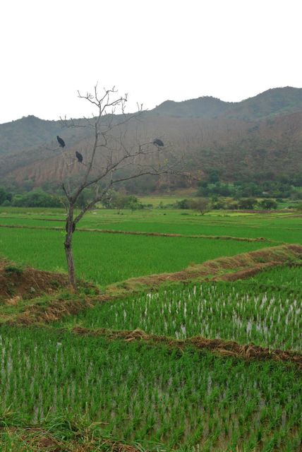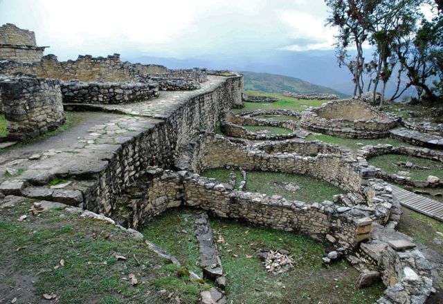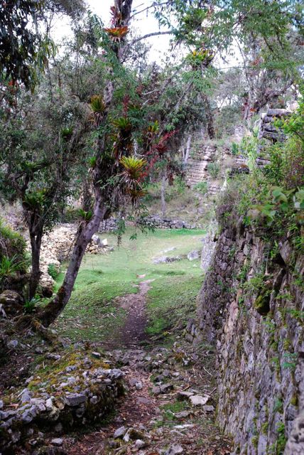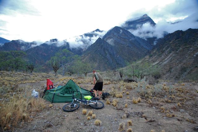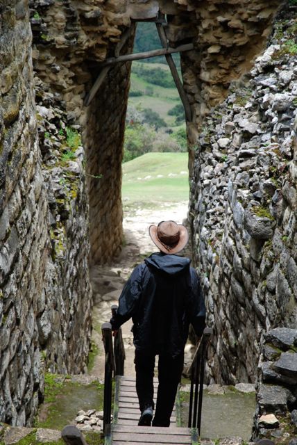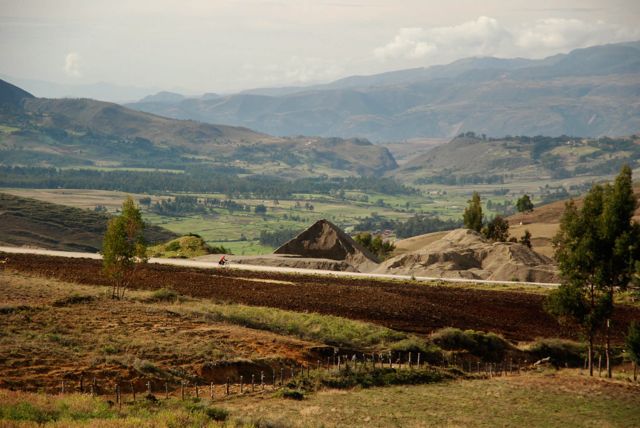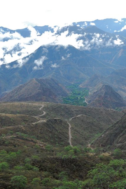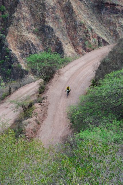 Having exhausted the paved road shortly after Yangana, the grind slowly up followed by rattle cautiously down pattern established itself more firmly.One of the better 'rattle-downs' went on for quite a while, through the village of Valladolid and well into the river valley beyond. Fun though it might be, we try not to contemplate the biting insects waiting for us at lower altitudes..As the downhill run through Valladolid peters out and we haul ourselves uphill again we realise it's camp o'clock. Without the prospect of much flatness we spot a suitable open-walled shed and pounce! 'Parked' next to it, this car apparently does work enough to run the improvised generator it's hooked up to. Making things work despite everything against you is the way forward.It wasn't the most restful of nights though - the denizens of the shed tuck into breakfast the next morning. Not shown are several cautiously friendly dogs, some ducks and lots of small piglets.. (Photo S.Hedges)Looking back to Zumba after a particularly effortful ascent. 27km short of the border with Perú, Zumba is the final shopping stop short of the next country - number 11 in our case!Dusk caught us still short of the border with Perú, so we added the local church porch to our inventory of camping spots. As bedtime vistas go, it passed muster. The following morning the local 'man who likes to know' quizzed us in a friendly way with the usual questions; and the usual warning that everyone in the next country is a thief who will steal your shoes! (Photo S.Hedges)After a day climbing up to San Ignacio from the border, the going gets easier with a gently undulating road that follows the river. Lots of the settlements are on the opposite bank to the road, linked by flying fox arrangements big enough to take live-stock!There's plenty of irrigated rice growing along this stretch; here complete with vultures watching for straggling cyclists....After some expansive, dry and cacti-laced valleys reminiscent of northern México, the gently inclined road up from Bagua Grande hits river gorge territory. There were a number of near-miss plunges as I tried to scope the river for a future return trip with a white-water kayak!One reason for taking this particular route was to visit Kuelap, a pre-Inca mountain-top fort that is said to be only rivalled by Machu Picchu, but without the thick layer of visitors. Getting there means a steep, muddy walk up from Tingo, or an antisocially early mini-van from Nuevo Tingo. Since we were staying in NT, we opted for the latter - but missed it, so treated ourselves to a calf-crippling 20km walk with the view to compensate...Getting into the citadel today brings you to a place of calm peace, but would have been a bit more of a challenge in days past (Photo S.Hedges)Once you're within the walls, Kuelap is full of tightly packed circles. (Photo S.Hedges)Bromeliads adorn the walls and trees that lean upon each otherThe diamond pattern, often with a central circle adorns modern buildings throughout the area tooAfter Leymebamba at the head of the valley, the easy going ends, and some slower but still very manageable climbing begins. 30km up with not much view to speak of - Sarah in 'high-vis' modeThen not too long after rugging up even more for the 60km long descent with loss of 2.6km altitude, our low point at Balsas comes into viewand just in case, here's a fully zoomed close-up! Hot, lush Balsas with the start of 45km up-hill hairpins on the other side of the valley40+km of continual downhill brings us into the heat, the layers come off, and we fly on down the twists and turns chased by an opaque wall of rain and cloudAfter out-running the rain into the mango-drenched stickiness of Balsas we quickly stock up for the next climb; and without discussion use the last hour of daylight to gain some height away from the worst of the insects. Packing after a night of rain, we soak ourselves in the view, and get into the headspace for a steady 6.5 hours at 6km/hr up out of the valley (Photo S.Hedges)Not too long after this look back, the clouds and rain closed in once moreHeading on from Celendín, and especially after Encañada, the land is rural and faster going down into Cajamarca.Once into Cajamarca, Tom gets yet another puncture in his front wheel. He's been soldiering on with a badly bulging and worn tyre for nearly 3000km leading to plentiful holes in the tube underneath. Now it's out with the old and on with a lovely, round, grippy new tyre. (photo. J Cruz)meanwhile in the dentist's shop which happened to be nextdoor, Sarah has a chipped tooth fixed in the time it took Tom to change a tyre and patch the tube! A very efficient set of circumstances :-) (photo J. Cruz)