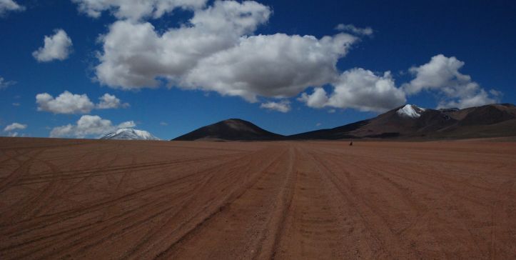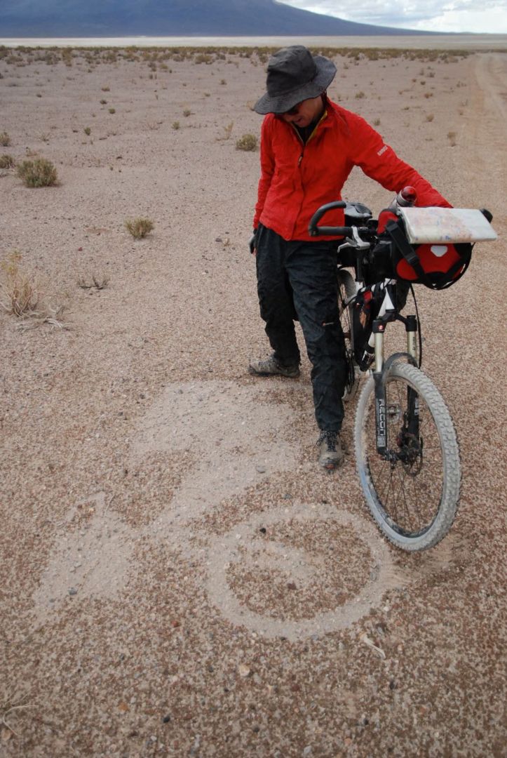 Lines in flatness from 4WD tourist carriers, carved in sand or hard salt/mud. On hitting sand, judging ride-ability and no option but to drop gears and keep balance. Best to keep moving, but not too fast. Concentration. Swirling skies bring tailwinds to help.