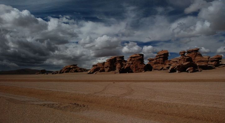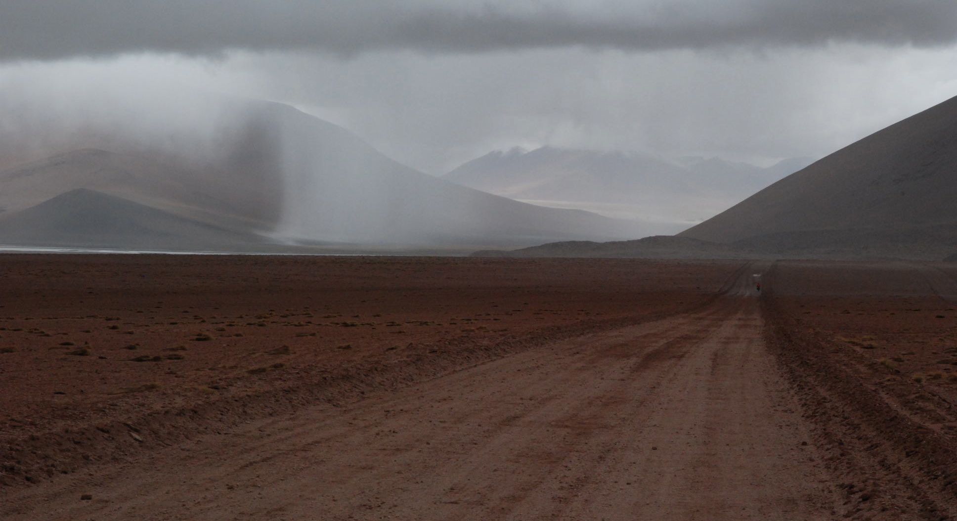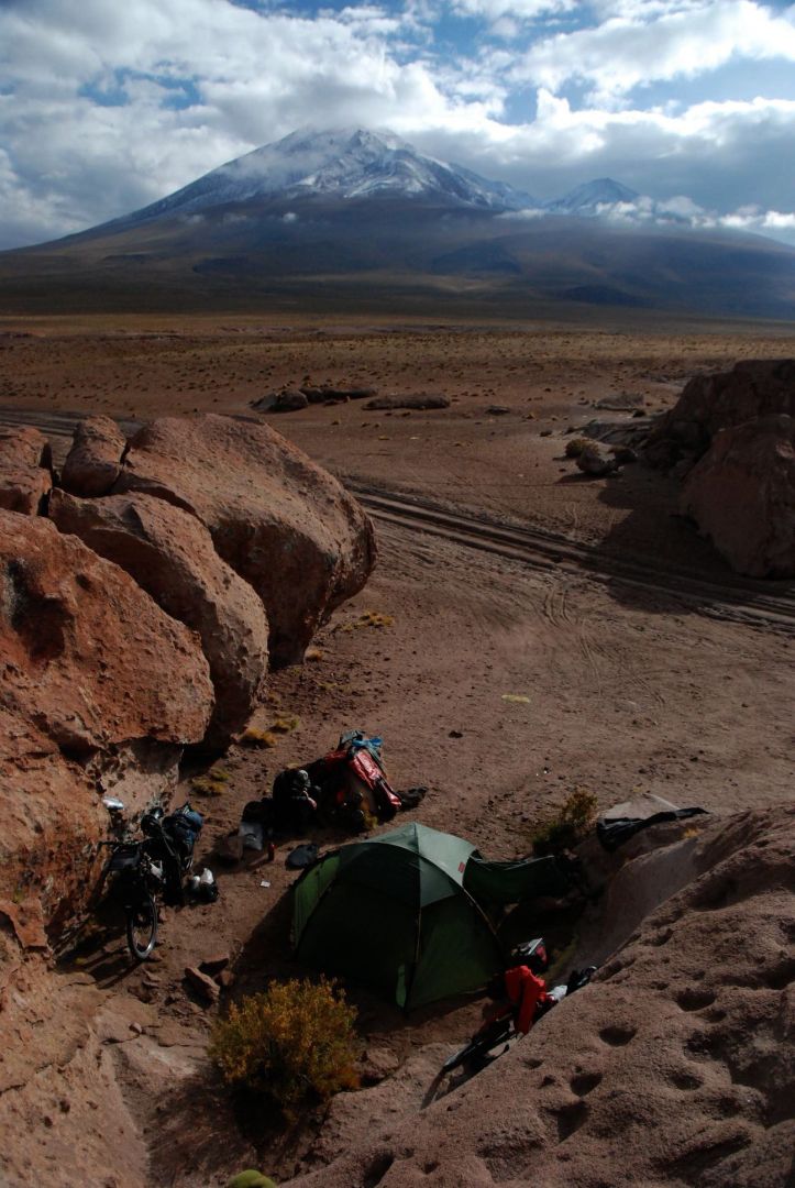 The flats only last until lunch, and even this is gulped hurriedly with light wafts of hail. Sarah ponders the shape of things to comeIt wasn't like this the night before! A wall of white storm hits us as we approach a rocky band just before the International road (to Chile in the west).For Christmas we were given a beautiful bit of sunshine to dry our tent and kit from the overnight storm. We also got rain, hail, washboard and lots and lots of flamingoesLaguna Cañapa - the first in a succession. The locals ignore the lunching 4WD tourists, the weather and us with practiced easeThe wide expanses of sand provide unwelcomely thought-provoking riding. But we can and do ride all of it - maybe given a help by the wet weather and fat mountain bike tyresNo escape from the late afternoon stormGlorious camping - clear dawn light on our snug warmness and a sunlit boxing day breakfastNot all wide open sand - approaching the narrowsPleasantly though-provoking rocky pass-bed.Even rain firmed the sand track riding exhausts. To change to a better line? Harder to change than to persist? As likely as not when a decision is reached, the original will be perceived better than the new....Shelter isn't frequent - a rocky ridge 20km before the Arbol de Piedra offers a good lunch spot or more if it were eveningtimeWe arrived at the Arbol de Piedra rock formation to a round of applause from the 4WD tourists who'd arrived the easier way. The unexpected celebratory status resulted in photos of us with multiple groups who'd passed us earlier in the afternoon. Very strange indeedThe elusive road on from Laguna Colorada. After waking to ongoing rain, a blessedly sheltered but late breakfast at the refugio, we managed to add over 6km to our already shortened day missing the more direct road to this.Unexpected clear sky, though with gathering thunder-heads. Looking back down a hill we found harder than we'd liked - altitude or more than 10 days without a rest?!