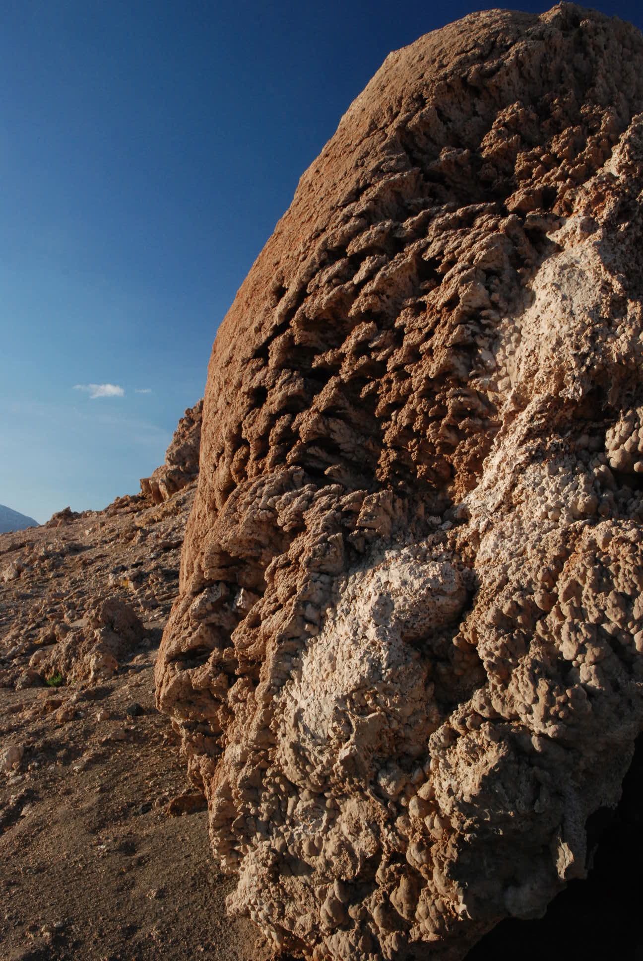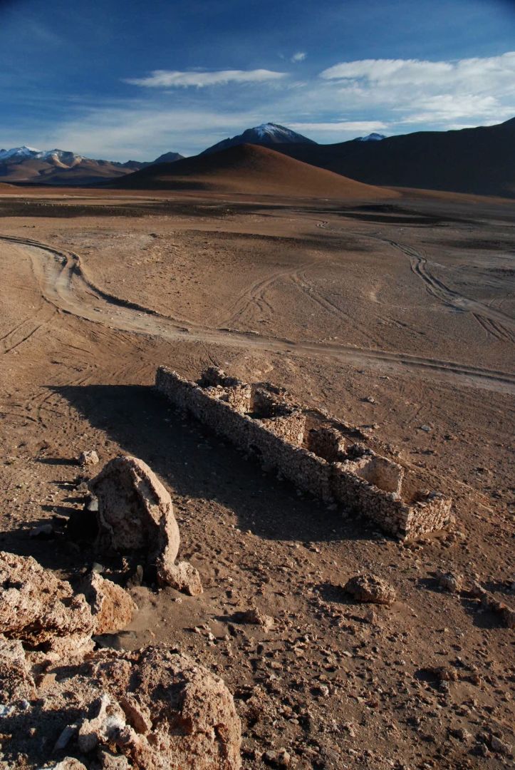 The glowering sky soon manifests. A forced halt to fix a puncture. I'm overwarm, so layers come off, but with this I cause a deluge - duh!. Bedraggled and dripping we sit amid 4WD groups in the restaurant at Laguna Chalviri nibbling on our cream crackers and jam. We must look in need - we're given leftover hot meals and bananas!Shafts of light splay colours on the mountains - rain holds off, though wind doesn'tA final campsite sheltered in abandoned buildings - our tent only just fits. And not only is there no evening rain, no overnight rain, but it is sunny in the morning too!Coral - left from a bygone age when the lakes were moreLaguna Blanca in reflective moodBorder crossings we have known! Leaving Bolivia - just a shed on a dirt road. The hot desert-bound Chilean tourist mecca of San Pedro de Atacama awaits us.