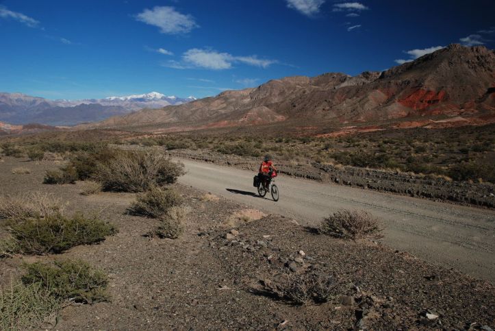 Believe it or not this road heading up towards Rodeo actually had a brisk tail-wind! Great way to gain height :-)Once up and tracking parallel to the peaks this is our standard view - lines of snow-capped mountains, low-lying scrub and barely a cloud to interrupt the bluenessAfter a siesta mis-timing in Calingasta tempered by ice-cream we ride onwards. Faltering cycling motivation coincides with a sign for Cerro El Alcazar (Fortress Hill) and an atmospheric camping find.Continuing south - mountains on either side blending with the skyNearing the high point south of Barreal the ferocity of the head-wind instantly drains us. Doubting the value of movement too hard won. Camping with all guys out and pegs weighted down with rocks - no hint of a hiding place from the infamous Andean windsA worthwhile diversion into Uspallata (siesta again...) for ice-cream (an addiction?) then back out again on the too-brief tree-lined blessed coolYet again, taking the smaller road strikes gold. The Viilavicencio road is a good'unAfter gulch-crowded, twisted climbing culminates at over 3000m, the descent flings us back down to around 1000m at Mendoza. What feels like the first real test of our brakes since Perú sees us overtaking timid tourist cars and grinning broadly