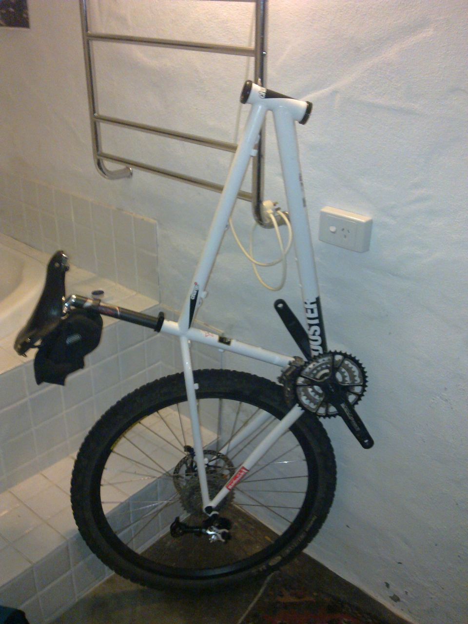 I find a nice water bottle in the shop and ask the girl if I can try it in my bottle cage for size. I return to the door – and stop, stunned to see the Big Dummy standing in solitary splendour.