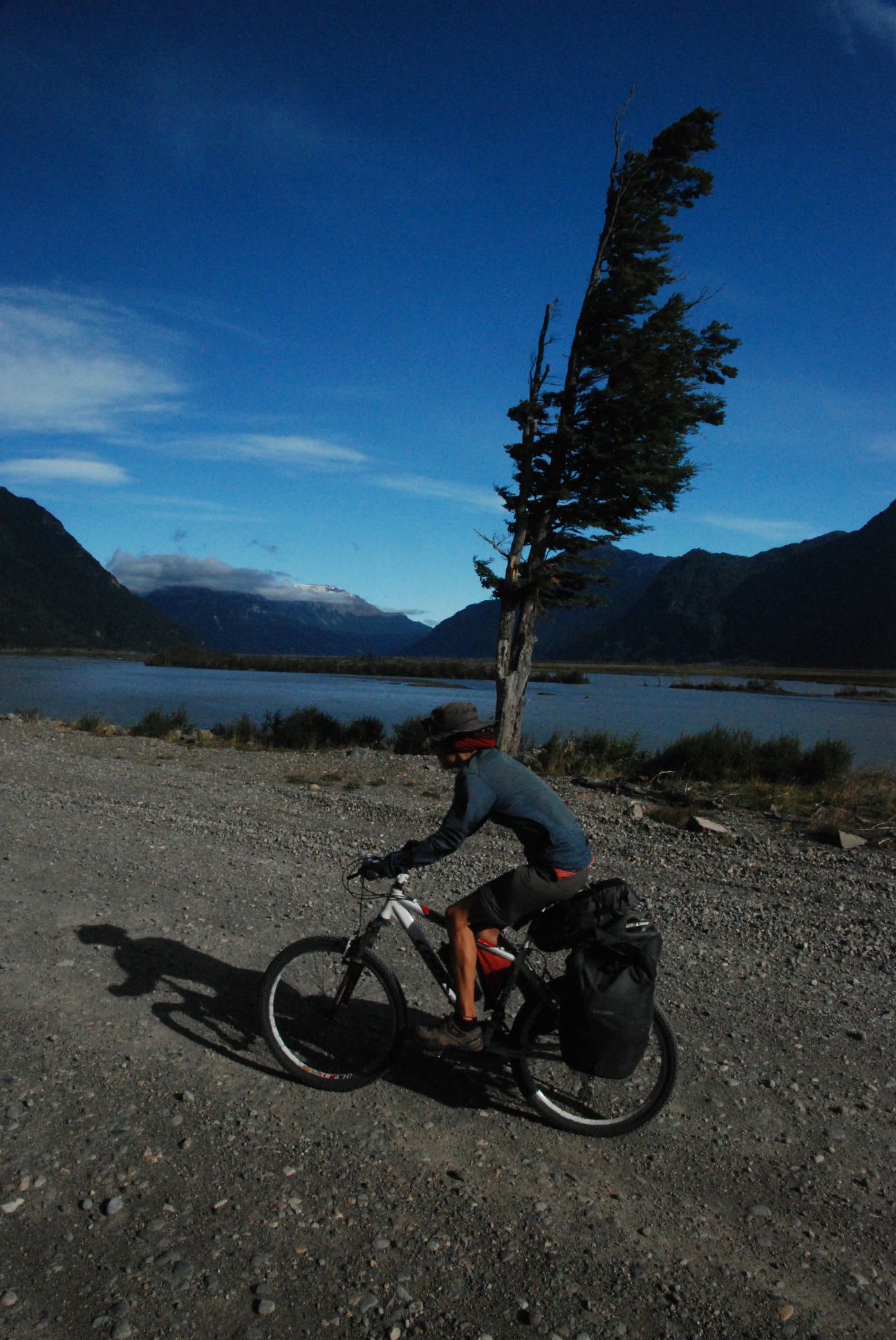 Team Angulo-Sepulreda – not phased when 4 instead of 2 cyclists turned up on their doorstep when pretty much no food was to be had in Coihaique. ¡Muchicimas Gracias por todo!Sarah managed, yet again, to get her bike fixed with only a half-day delay. 100km south of Coihaique got us back onto ripio, and we were graced with glorious weather to boot.The campsite views can be pretty special tooMind you, when the going is westward, life gets pretty breezy!Thankfully, the road soon turns south again, heading downriver towards Lago General CarreraOvershadowed, but ever-present, the other issue in Chilean Patagonia is the potential construction of 5 dams by HydroAysen. Our route is littered by enormous billboards pushing one view or another – this one against. The pro-brigade claim that the locals want them, but interfering Santiago pretends to know better.We’ve missed the season, which must have been spectacular as the sheer number of rosehips attest.In contrast to parts of the northern Carretera Austral where the going was more rural-tended, we’re now thoroughly in frontier territory – that with wild weather and more.We catch Lago General Carrera (the name of its Chilean half) in a glass-like moodThe outflow into Rio Baker a pure dark turquoise shaded by glacial melt – salmon pink bridges contrast.Harking back to Northern Argentina and Bolivia, afternoon rain broods, and we pass only lightly wateredAt the beginning of a morning dash to coincide with the Puerto Yungay ferry, the overnight mist lingers, while the peaks glistenMost of the traffic is ferry-timed-clumped. Good when the roads aren’t all that wideOur ferry, until today daily due to protest induced fuel shortages, turns out to be back to thrice. We are nearly stranded to wait for the next at Puerto Yungay when I arrive 2 minutes late (but 2 hours early for when we thought it was scheduled). They spot me and turn back.That leaves with only 100km left of the Carretera Austral – flat for a while as it works its way upriver. We find a vantage-camp at a mirador (lookout) that leaves an easy day to Villa O’Higgins at road-end. The next morning we’d be hard pressed not to be in the wilds of TasmaniaFast lake-side progress - not keen to stop long as more than a 10 second pause attracts a storm of slow moving but persistent mosquitos. Lunch is gobbled clad in clothing layers such that only eyes and mouths are exposed.Lago Cisnes – nearly there.Villa O’Higgins – a place where you leave your keys in the front door