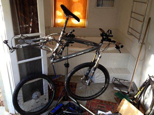 Before venturing forth a little reconstruction is needed. Sarah's bouncy bike had donated a number of parts to her, in the end, ill-fated touring bike. The joy of a nice clean bike hoisted to a comfortable working height and plenty of available parts should not be scoffed at!