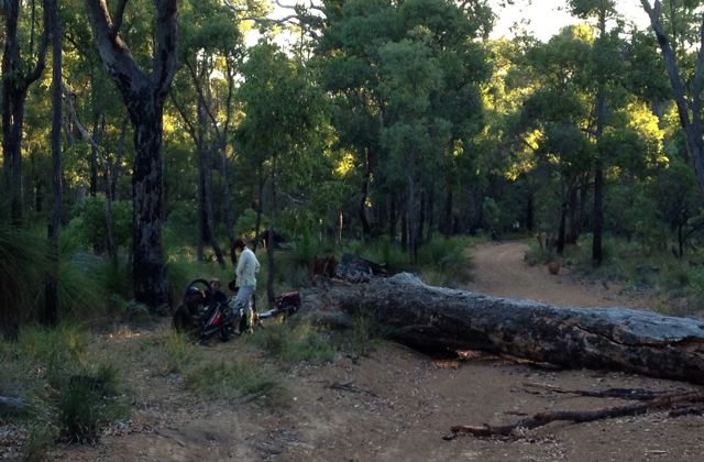 Winding its way south via a mixture of technical singletrack and less demanding rail-routes along with quiet dirt road; the Munda Biddi trail is a great way to get out of town for a day, weekend or longer. Just follow the blue sign posts and yellow tree tags...The trail has a string of huts civilised distances apart. As well as picnic benches and sleeping platforms they even have bicycle repair stands. This all meant that Sarah managed to get all she needed into her seat pack.There's lots of pea gravel meaning that big tyres are the way forward, helping to minimise pushing episodes and face-plant potentialAs the shadows lengthen Ben and Rachel pause to mend a flat. The bush surrounds us with bird calls and peace. A little further along we spot 'roos for the first time since getting back to AustraliaDuring a pleasantly lazy start the next morning I manage to get on with some of my own repairs. Swapping out the jockey wheels from my rear derailleur - totally and utterly worn out after the Americas tripBack the way we came - this time - following the line of an old railway through the forest, passing a WWII internment camp, returning to our cars at Jarrahdale.All the way back we're trying to keep up with Leio, who's got a yearning for lunch. Despite a bike that doesn't really fit, he's having a great time. Even after losing some skin in a nasty encounter with some deep pea gravel.