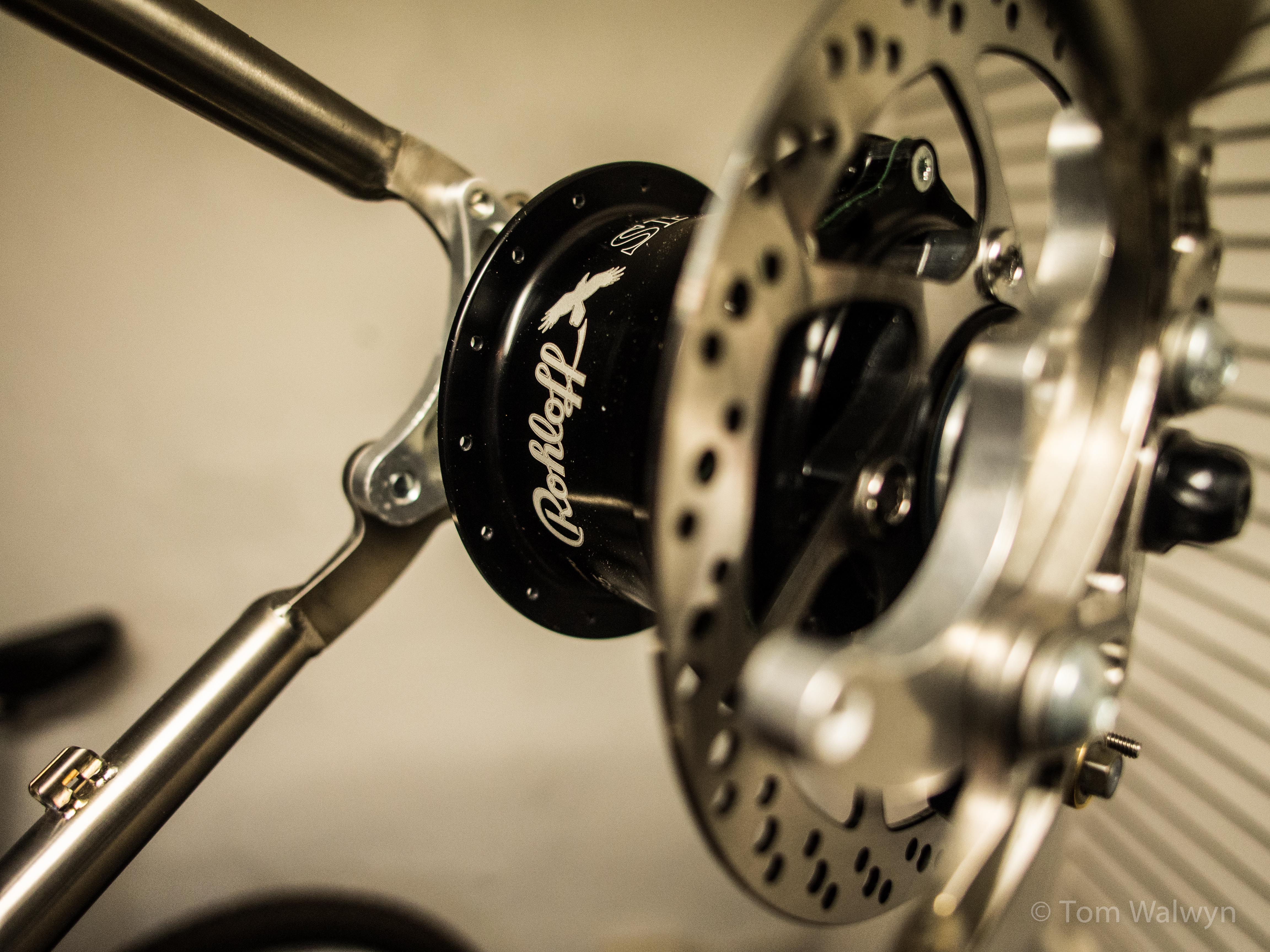 • It’s got the normal pugsley offset – mainly in case I want derraileurs later. In minor hindsight I might have pushed for a symmetrical 135mm rear to run a rolhoff with fat tyres as long as you don’t want to go above huskers on marges and maybe a more conventional 29er set up if you wished. Maybe with enough space for 29×3″ too… That’s what we’ll be aiming for on my wife’s bike as she wants to be able to do 29er expedition touring in the future with the same frame.