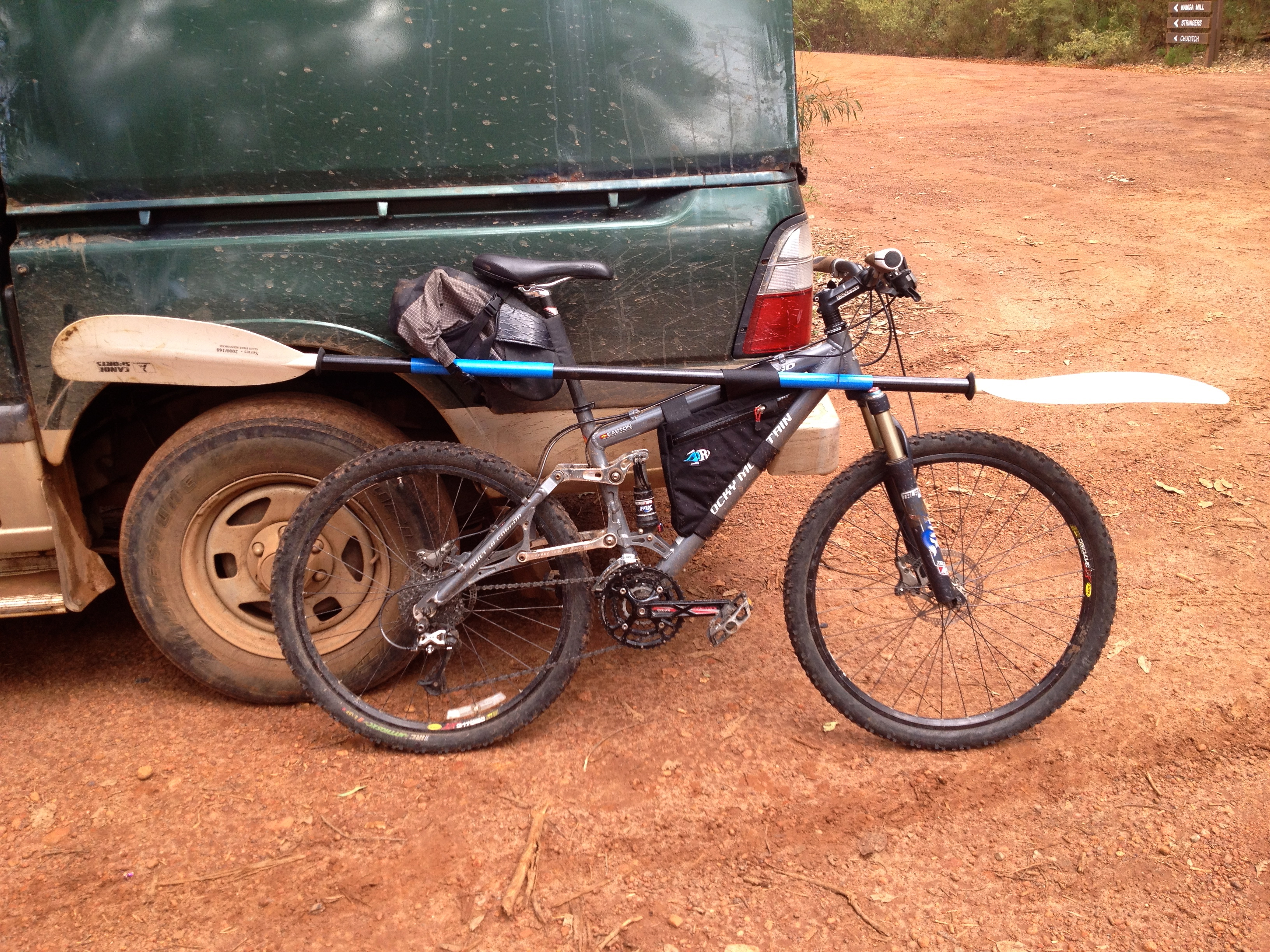 I got back to my car way earlier than necessary on Sunday morning and drove back upstream to collect my bike. Lurching my way over a rough washed out dirt road and tilting precariously to one side in a deeper-than-expected puddle, I decided that the driving was actually the most challenging part of the whole weekend! I don’t think I actually like four wheel driving all that much. Especially not with a sea kayak working its way loose on the roof.