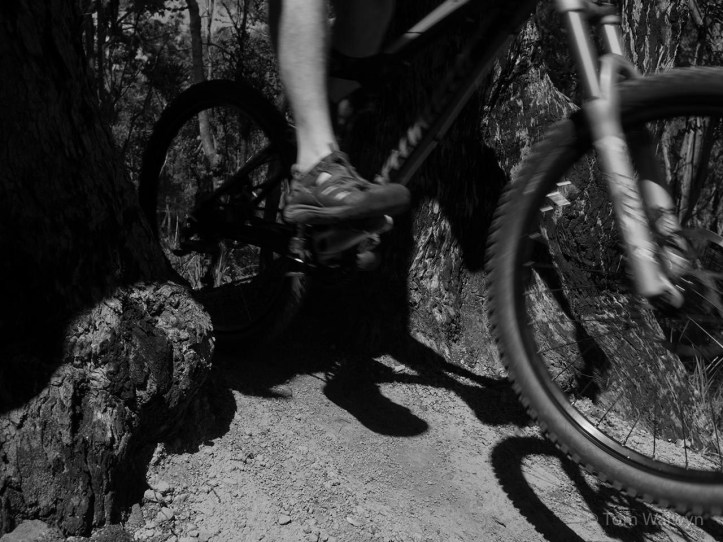 Having spent a couple of hours over the weekend re-juvenating Sarah’s hastily pre-trip discarded back wheel (new drive-side spokes; the old ones chain-mashed with a late-noticed loopy rim), I’m riding un-fat to test it.  The dual-squish allows greater speed and  fewer consequences of a poorly chosen line; not to mention a greater jumping confidence.  Grins and the odd giggle with the last (no audience) are tempered by a few near hits as I forget that narrower tyres don’t suffer fast-cornering fools gladly.