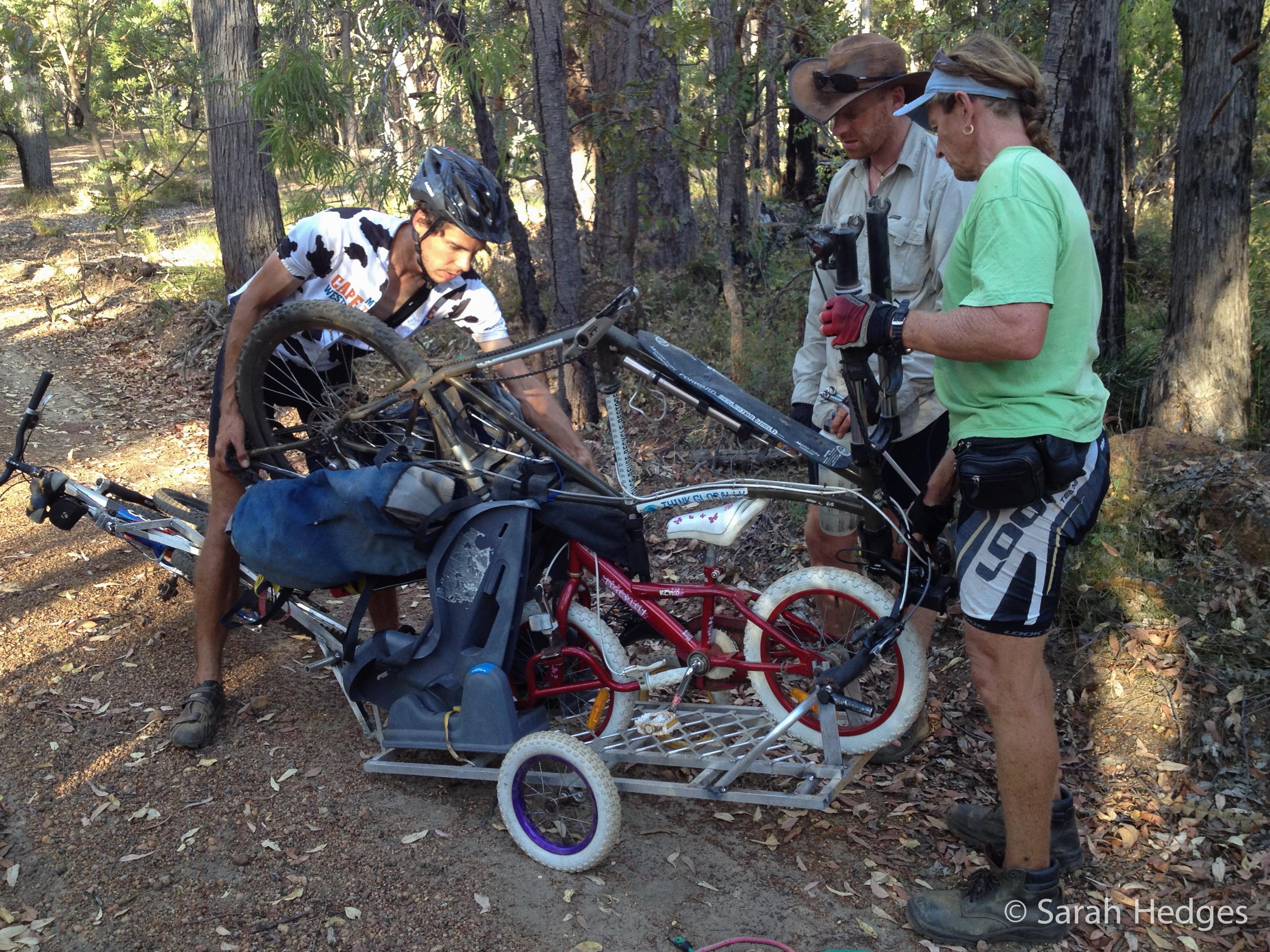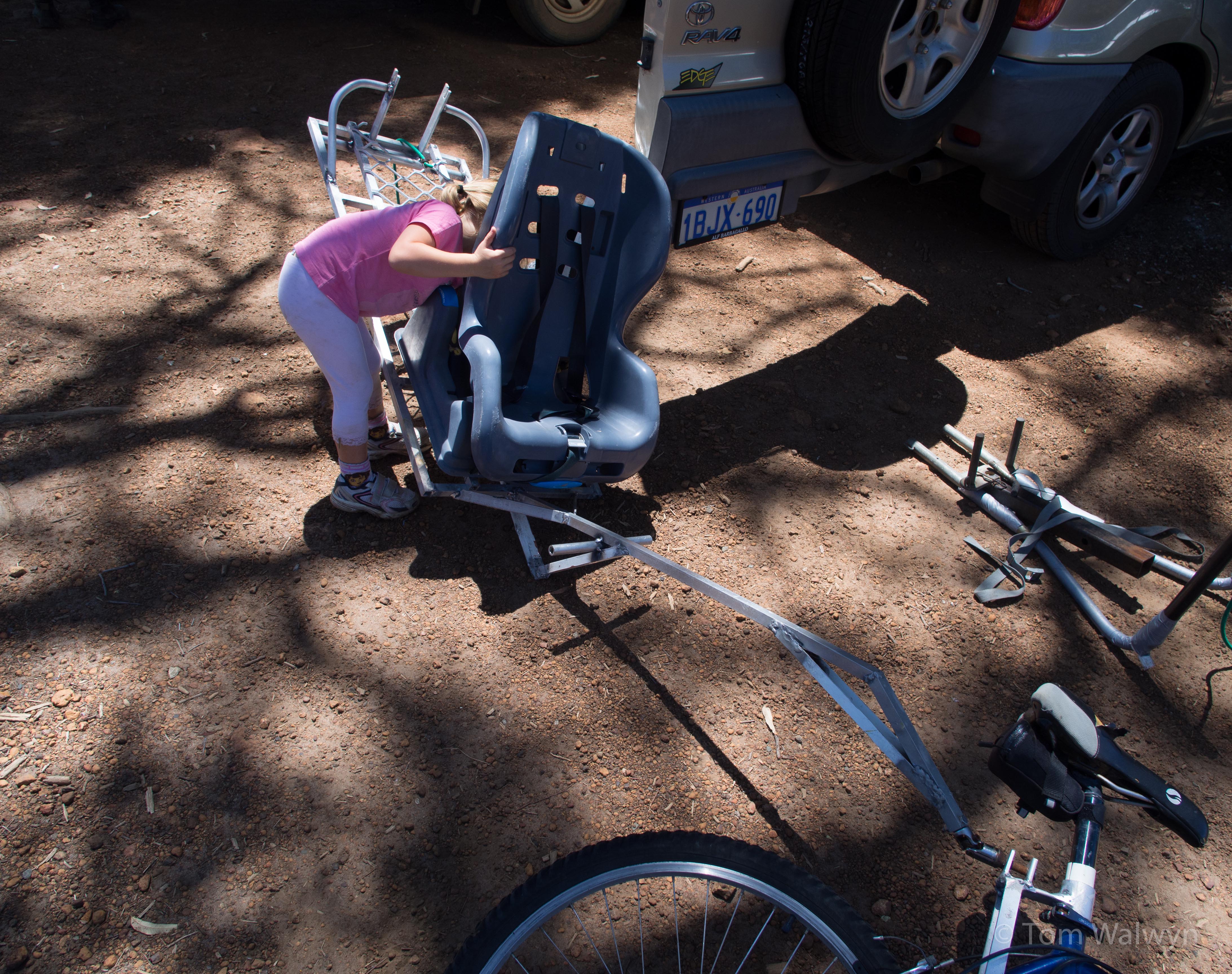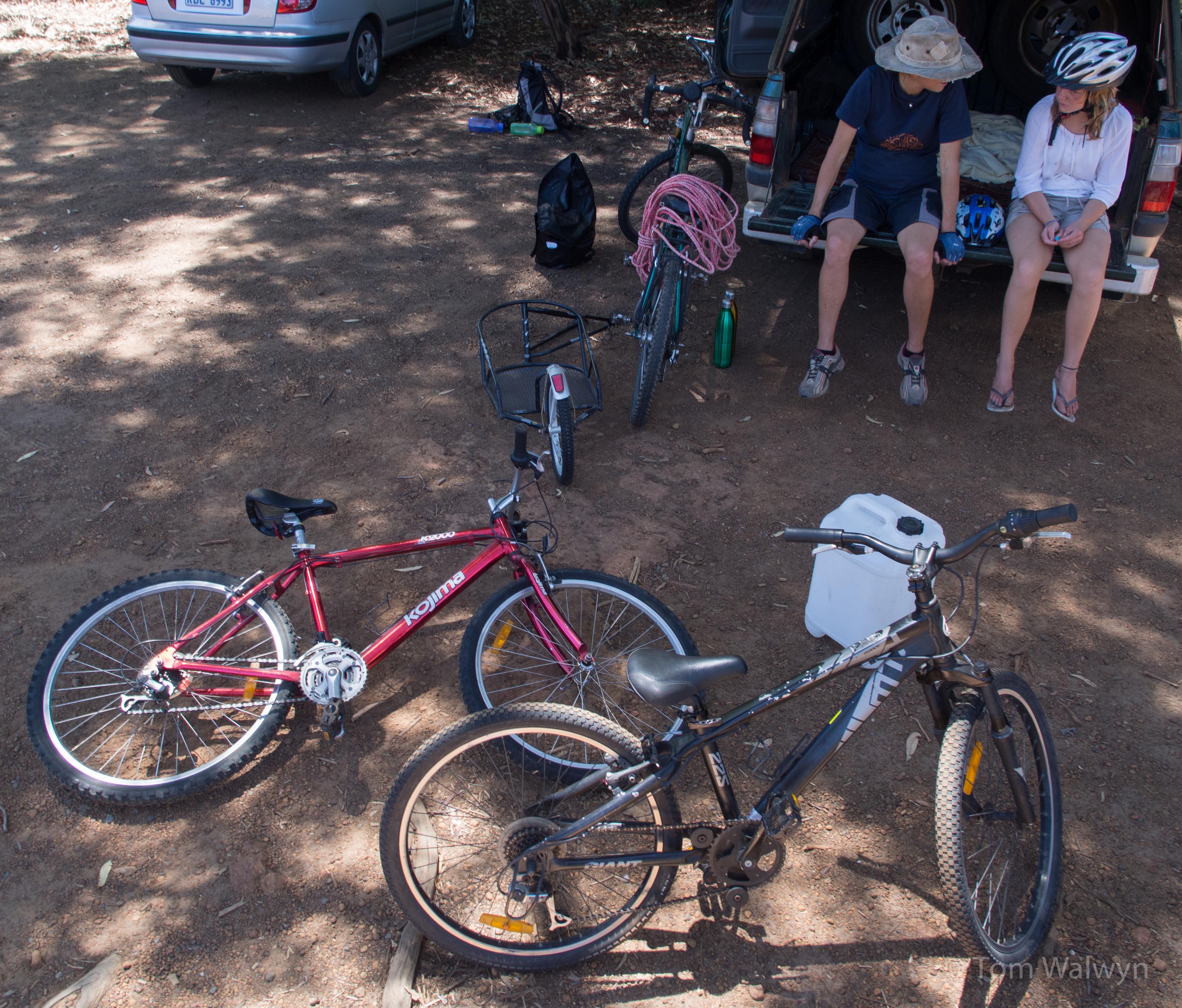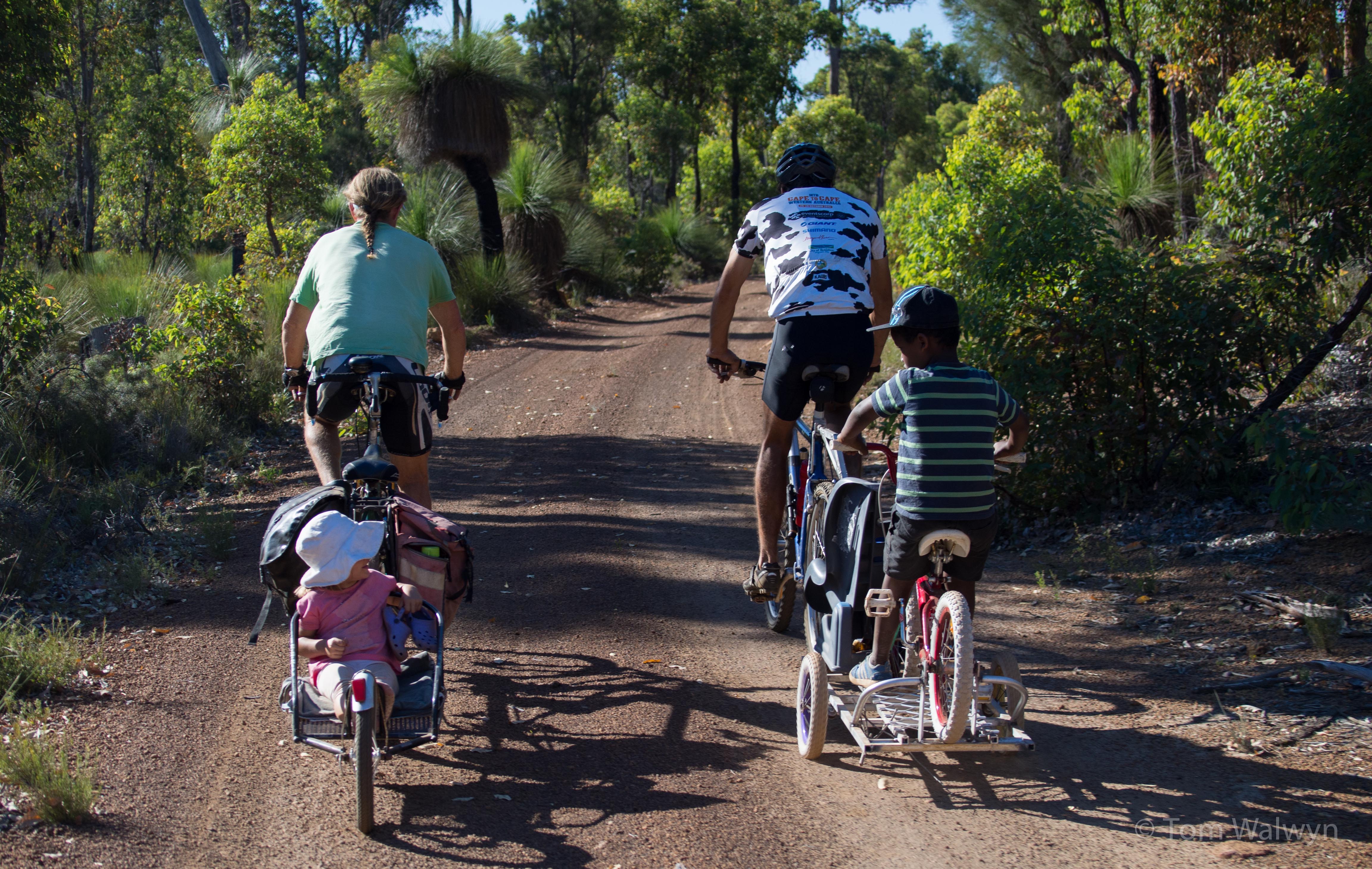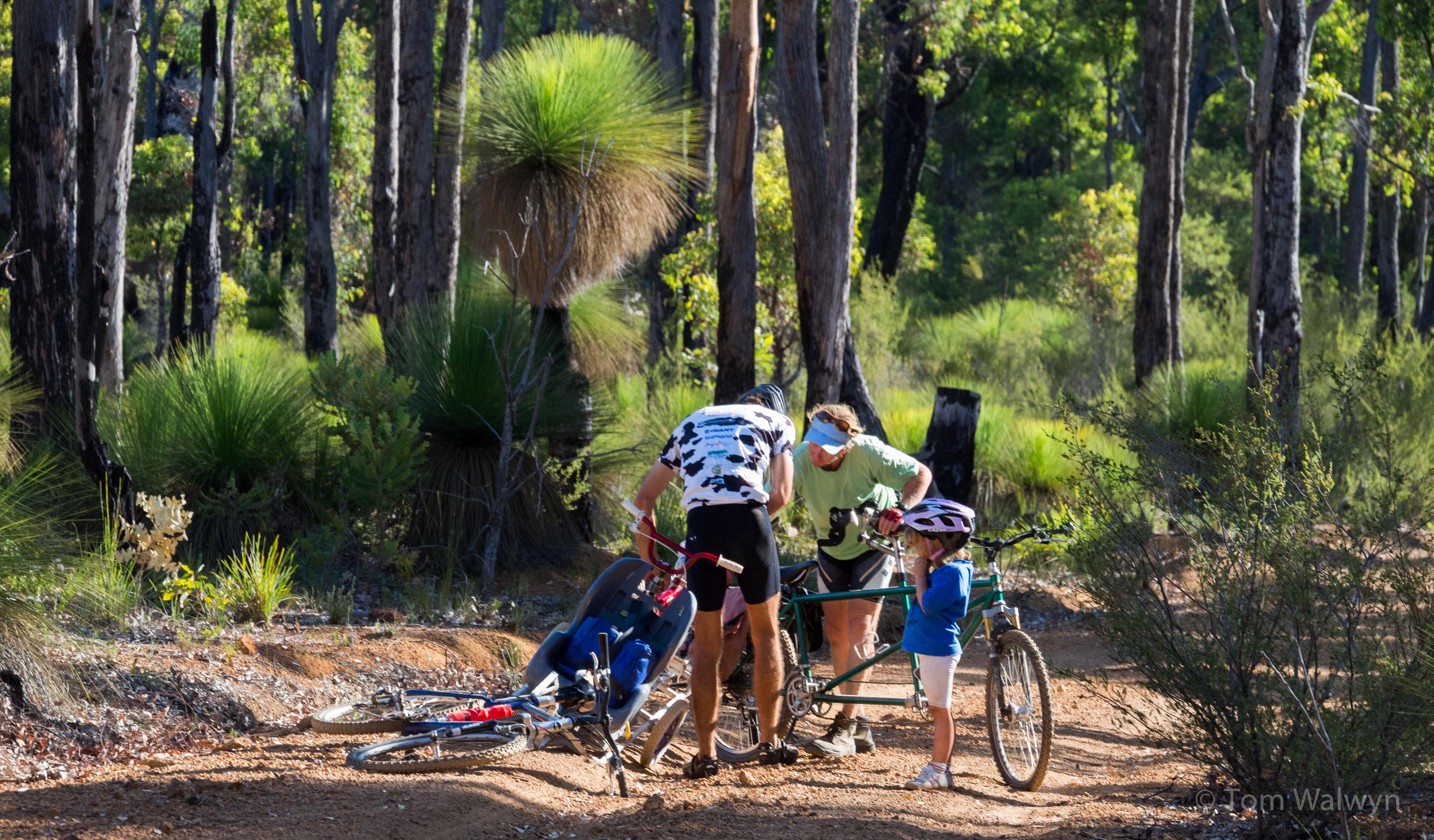 During the 14km from Jarrahdale to Balmoral, it becomes obvious that the major sticking point is not going to be the understandable desire of the younger ones to experience all the available carrying options, but a succession of inexplicable tyre valve-base failures in my front wheel.  Despite my best efforts, with a puncture every 3km, I quickly use up the group’s supply of spare inner tubes.