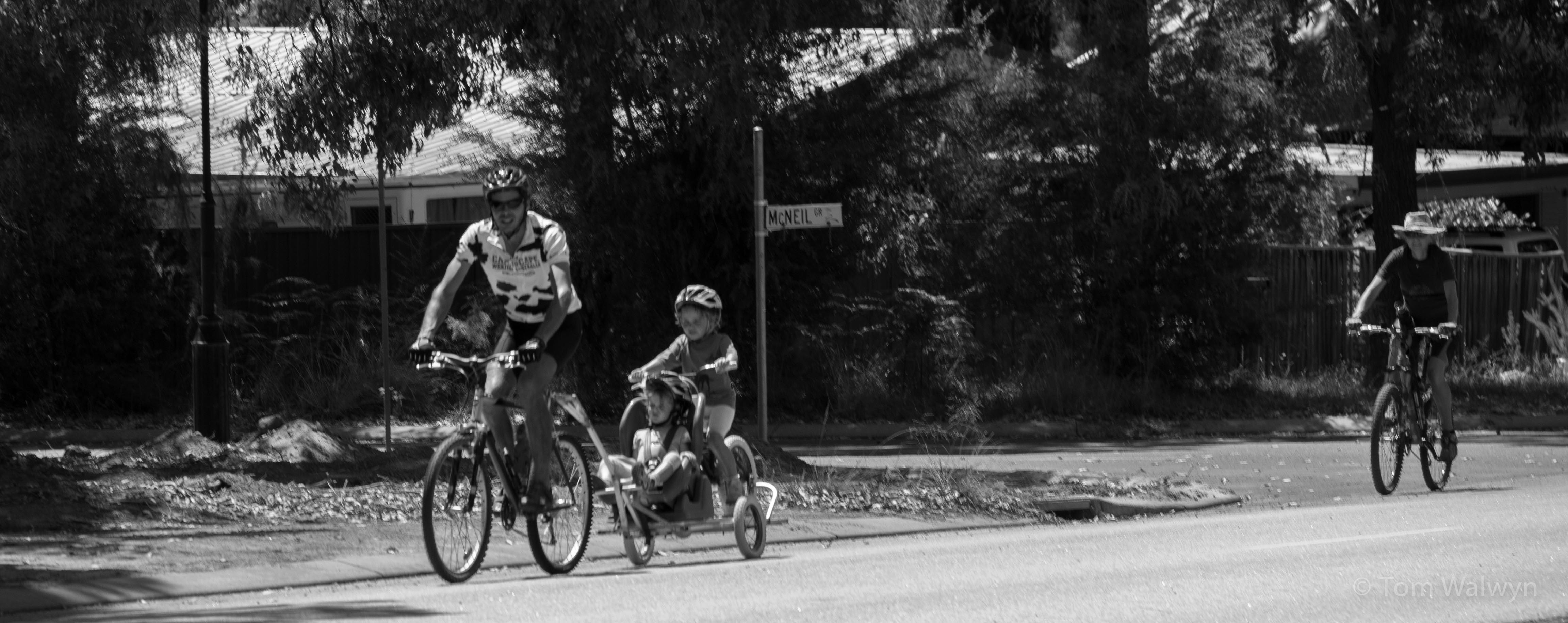 Greg and his daughters take the lead – followed by Sarah on the look out for anything that might fall off or be discarded along the way (e.g. hats, helmets, socks, shoes and banana peel)