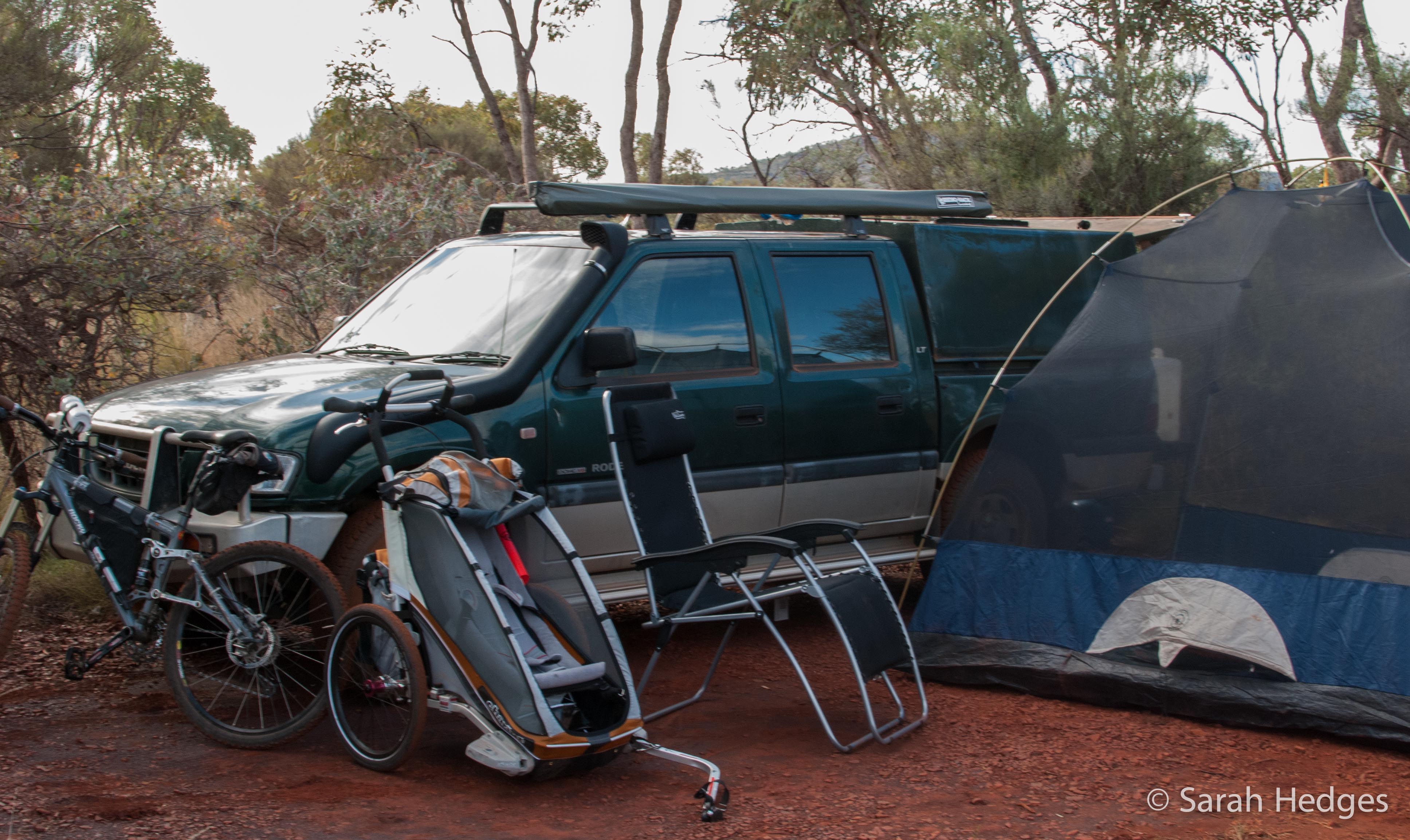 More luxuries of car camping: my bike, Bryn’s Chariot, one ridiculously plush camping chair and yep, a choice of tents. This one is my preference most nights: a giant mozzie dome that allows us to watch the stars but keeps the bities at bay
