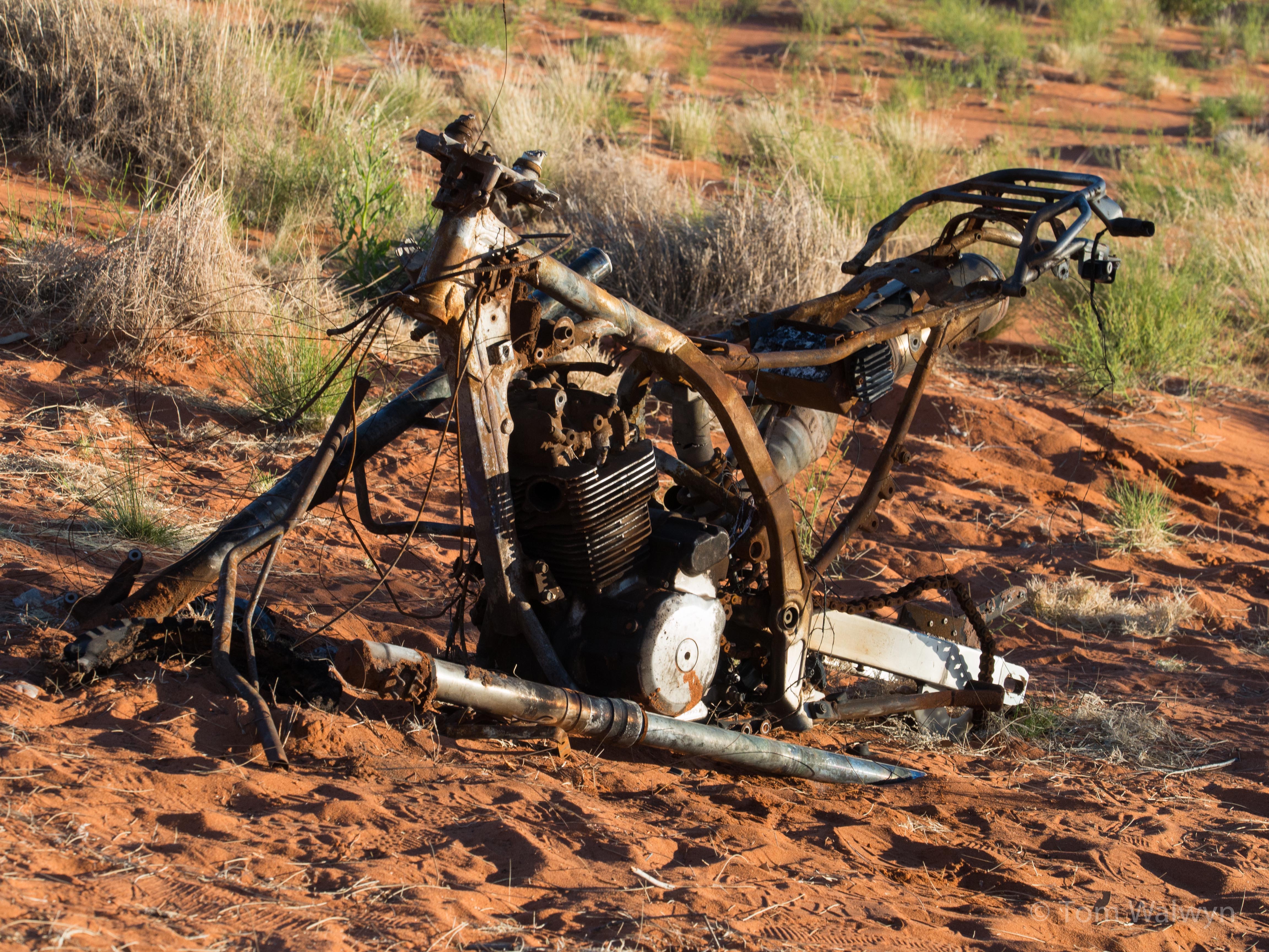As well as the mostly infrequent smattering of burnt-out 4WDs, this motorbike remains a scavenged monument to the self-sufficiency asked of everyone on the CSR