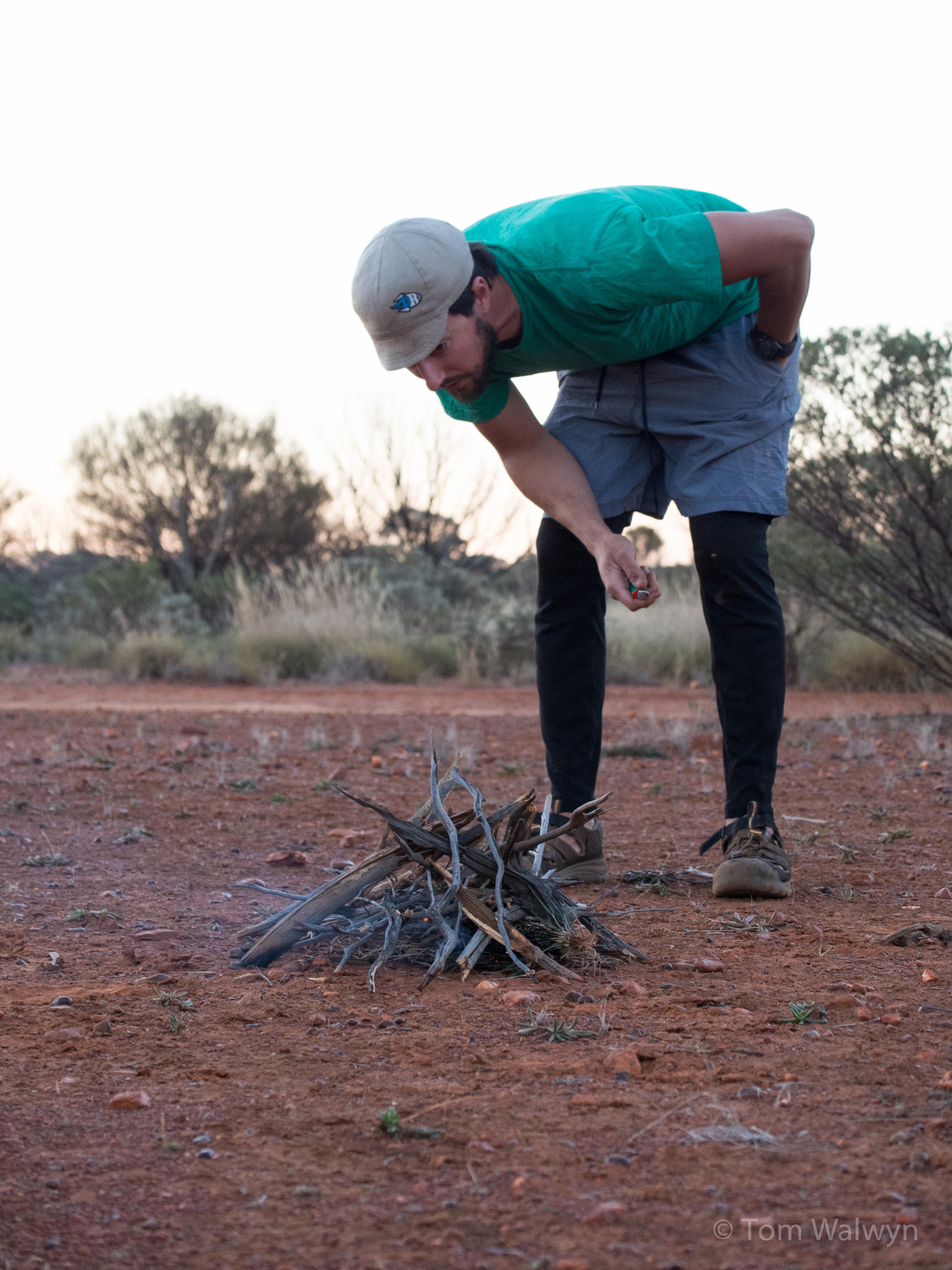 A ‘time to stop’ camp-site. No worry of meeting others, as what traffic there was stopped long before we did.In the south, the loss of the sun brought on down jackets and comforting warmth. Later on it took a lot longer to cool down.A start (no shortage of dry firewood for us – not that we needed much)food for one sitting ready for boiling water – latterly we allowed ourselves an extra between us as our need increasedanxious momentsthough we did have a stove and limited fuel, most of our cooking was fire-centred.leading to a time to sigh, maybe talk, and let the food start the recovery in time for bed. Dark determinedThe morning after the fire the night beforemorning waking – bird-call roused