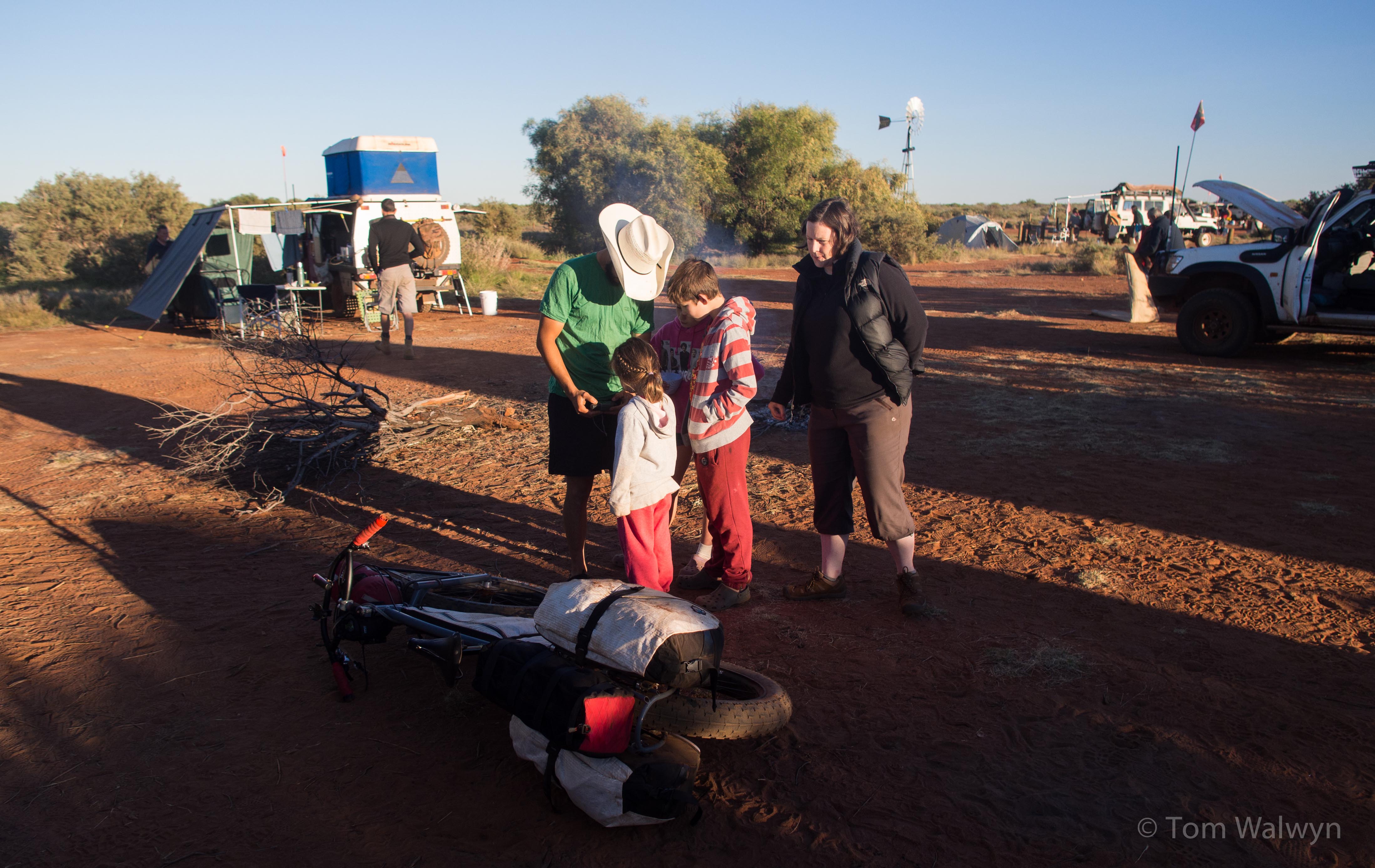 Two vs Three Wheels. Scott, aided by some Rick Hunter magic, was the first unsupported cyclist to ride the route without a trailer. It’s possible that if I didn’t already own a long wheelbase bicycle and thus hadn’t been thinking with a view to my ‘stable’ after the CSR, I would have gone in the same direction. I think I also had visions of such horrific dune pushing-fests that being able to dump the trailer weight and do a second take would have been more important. My day-mares didn’t come to pass, and I reckon that what pushing we did was easier with the drag from only two, rather than three wheels.