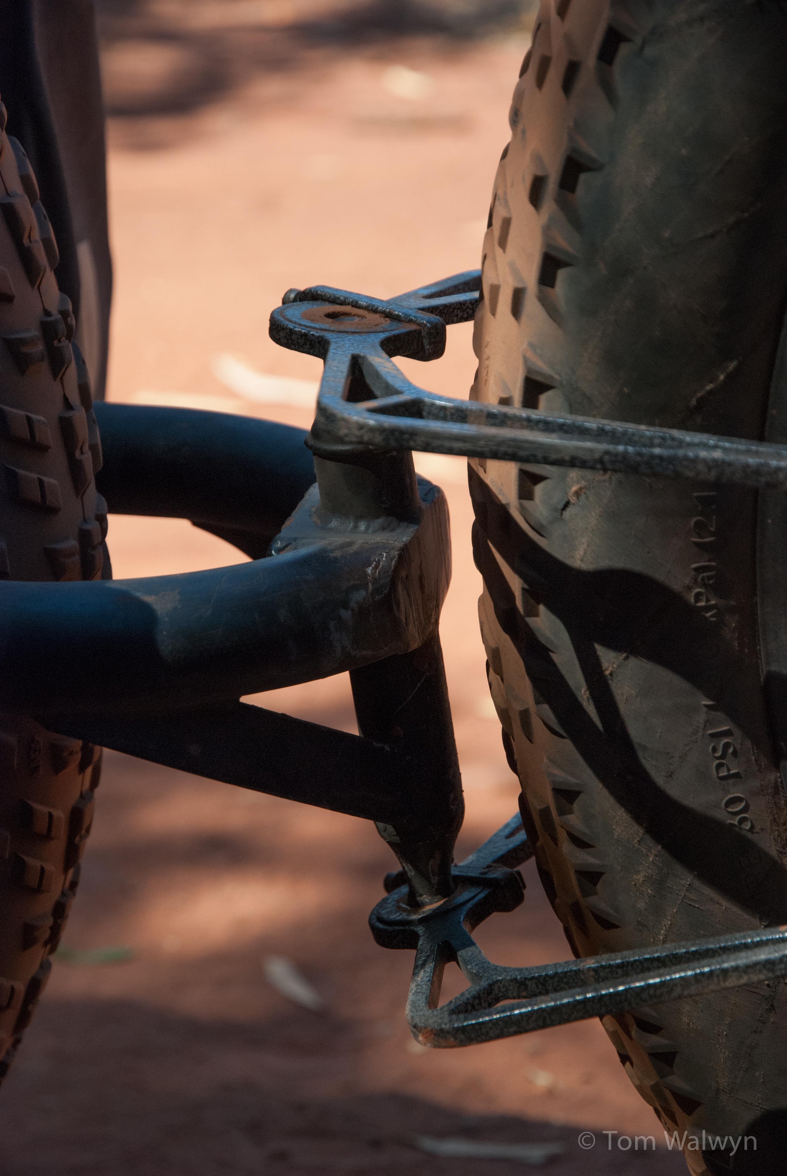 The earlier ‘fat’ cyclists didn’t really have as much choice, so used 65mm wide Large Marge rims for their bicycle wheels. The rim part of the ‘fatness’ equation contributes to a wider, flatter footprint for increased floatation in soft sand. It’s difficult to say whether the 100mm clown shoe rims would offer further advantage. Their additional width does add ‘interest’ to the chainline and gearing set-up. Tyre choice for us was dazzling – and likely to get more so, with the arrival of the ‘big players’ (Specialized and Kona etc), in contrast to the unsupported cyclists that preceeded us. Variables include width, tread pattern and casing weight. The bicycle frame used dictates the maximum rim/tyre width – meaning that I used different tyres on front (Surly Big Fat Larry, 26×4.7″) and rear (45North Hüsker Dü, 26×4.0″), whereas Scott used Big Fat Larrys for both wheels. I would say that it was worth having more ‘float’ on the front of the bike as it gave better control coming down the dunes at speed (up to 35km/hr in my case). These tyres are actually pretty thin (or they’d be even heavier), so do puncture. We both used a combination of Surly Toobs (heavy) and Specialized 26×2.7-3.0″ DH tubes (much lighter) with no noticeable difference in wear or punctures between the two. As already noted by Martijn (2011), if some latex/’goo’ can be added to the tubes, you’ll save yourself a fair amount of time as all of our punctures were thorn related. Though we’d thought to do this, neither of these tube types has a removable valve-core, rendering it impossible.