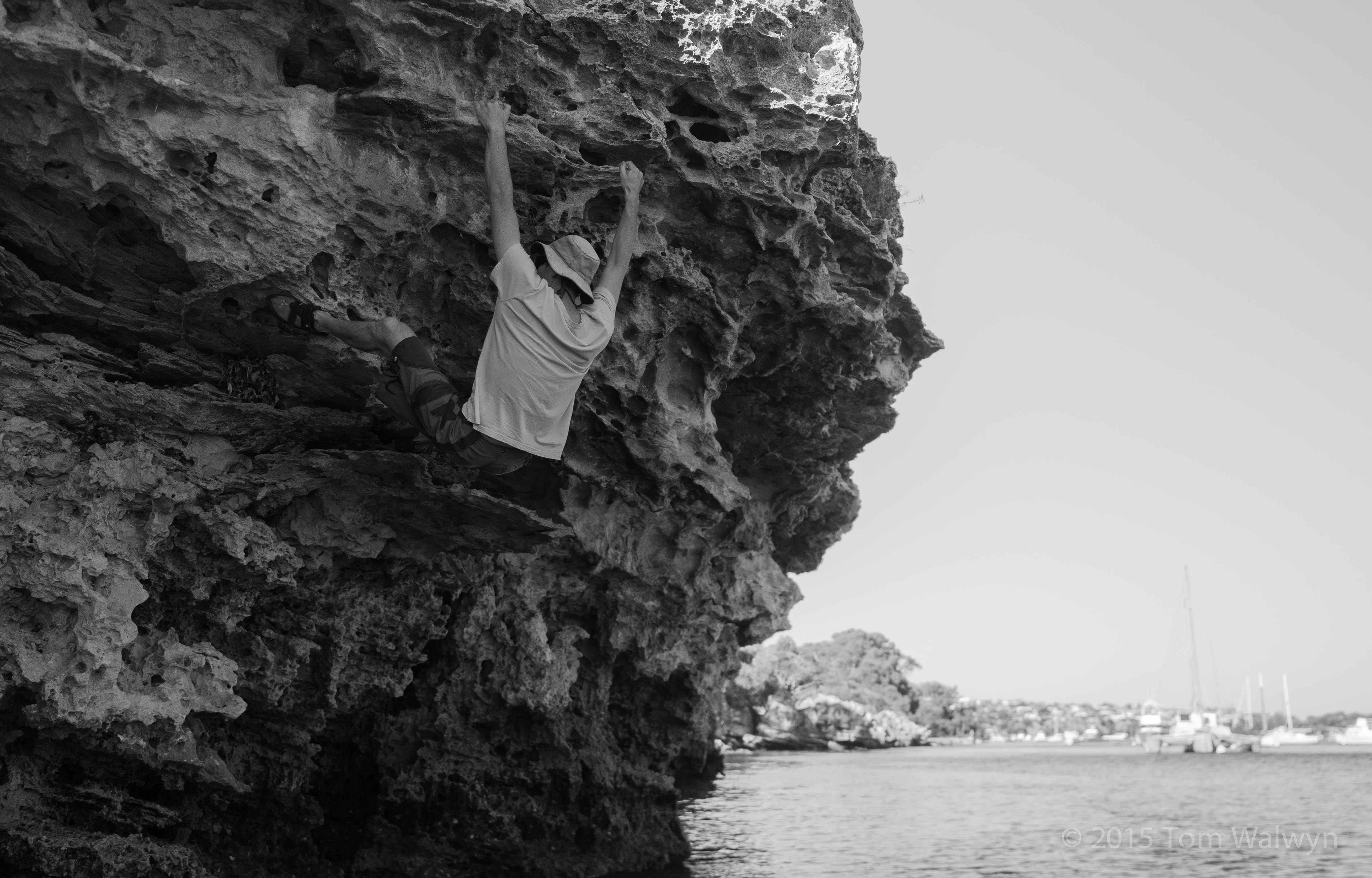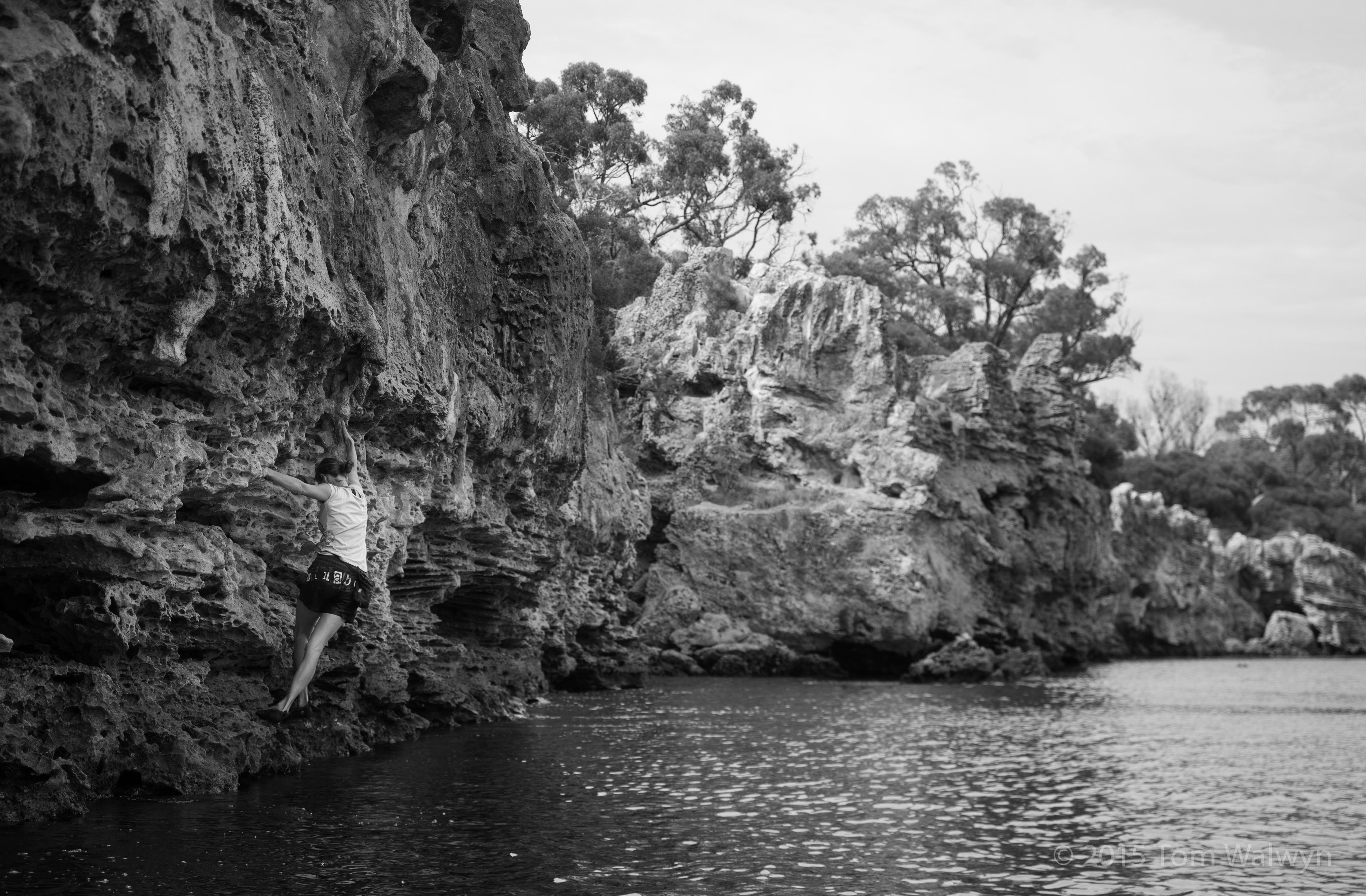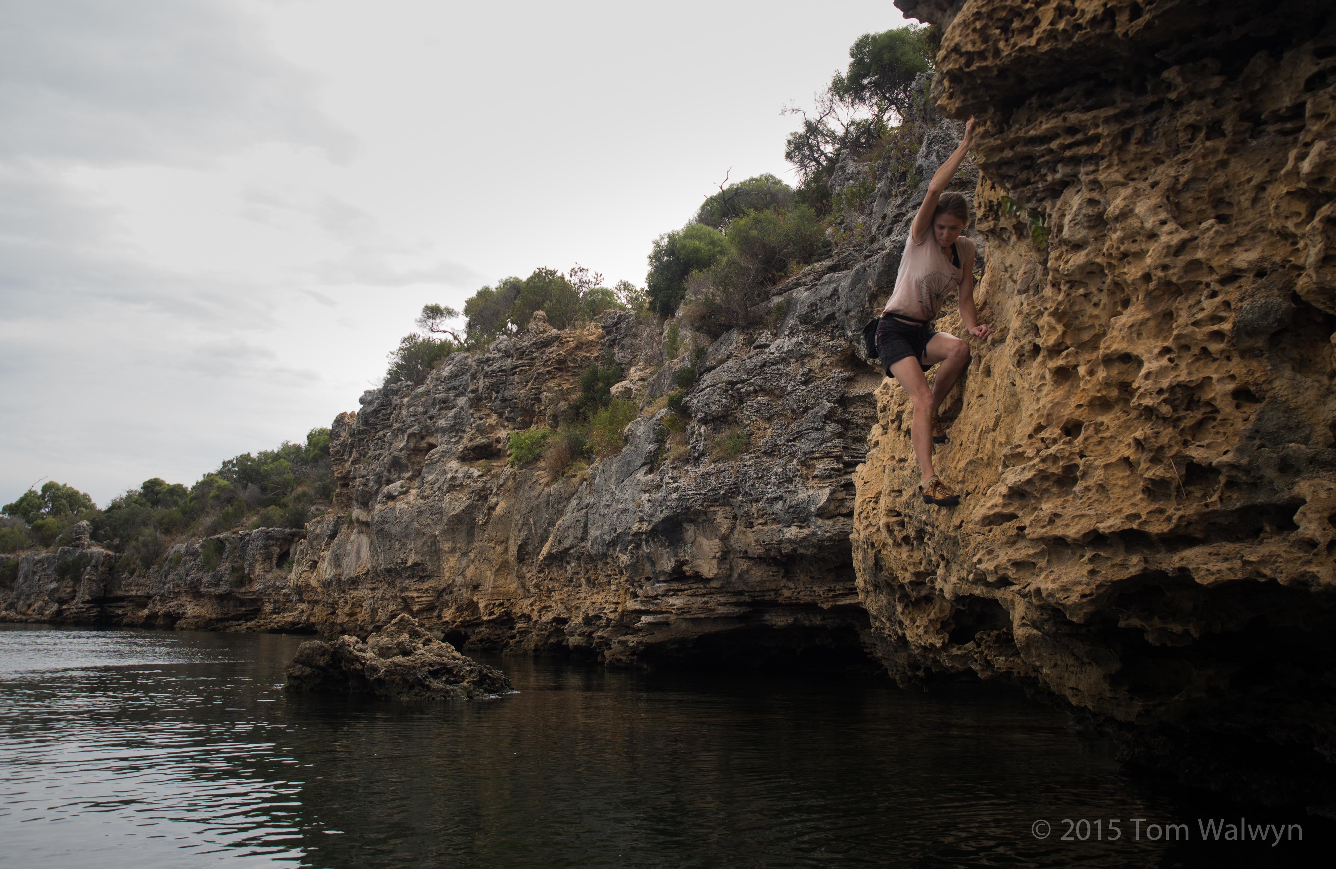 Twenty minutes by bike or half that by car from our front door is the Swan River-side limestone cliff of Blackwall Reach. A few hundred metres long but maybe 15 metres high at the most, it is a place we wish we’d made the most of when we first moved here. Our recent routine has been to launch a kayak nearby to carry one of us with Bryn while the other ‘deep water solos’. The climbing is free of ropes and extraneous clutter. There’s a longitudinal line of least resistance that has a few tricky sections to encourage forearm ‘pump’ or splash-down. Increasing familiarity leads to contemplation of more testing vertical ascent options together with greater commitment to smaller holds – the possibilities are considerable.