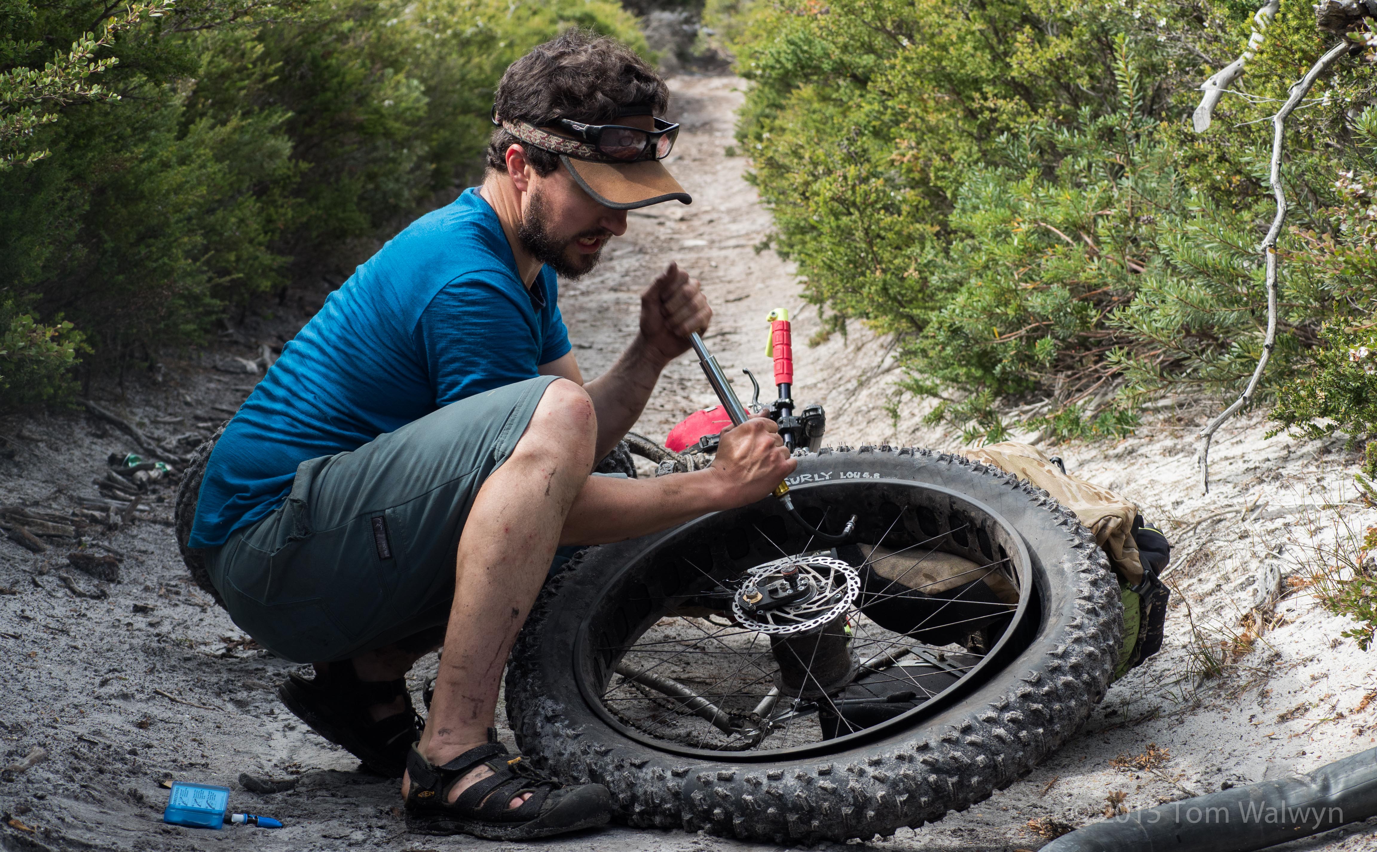 Scott working on the only puncture of the trip - the result of whoop-bombing down a steep rocky descent :-)